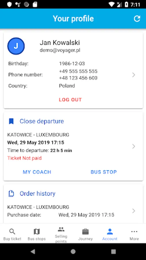ACCOUNT - offering the possibility to create a Customer Profile, where the user can view, among others, into the history of your tickets and tickets related to the upcoming travel. In addition, creating a profile allows you access to the BUS INFO tool, where the passenger, an hour before the scheduled departure, can view the location and the number of his coach.