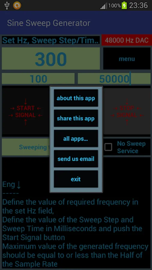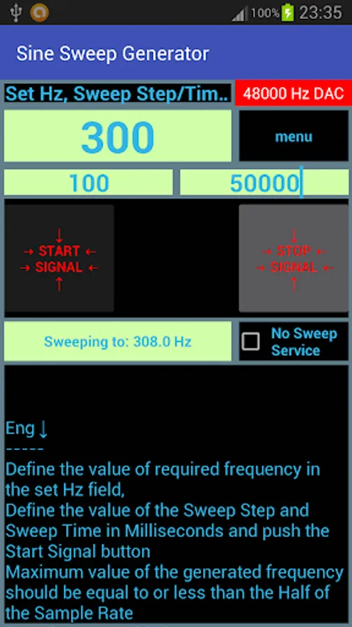 This Sine Sweep Generator could generate the sine sweeps. The effective range is 35 - 24000 Hz. For better experience it is recommended to use external amplifier.
