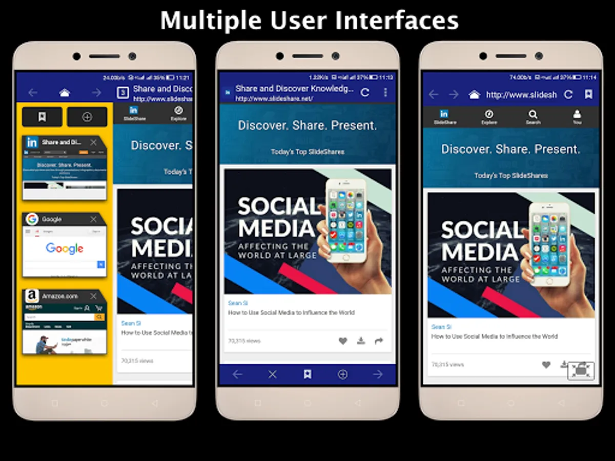 Web Browser has 3 different user interfaces so you never get bored from same ui on your smartphone and Tablet. It is designed for both phone and tablet.