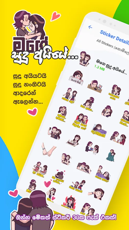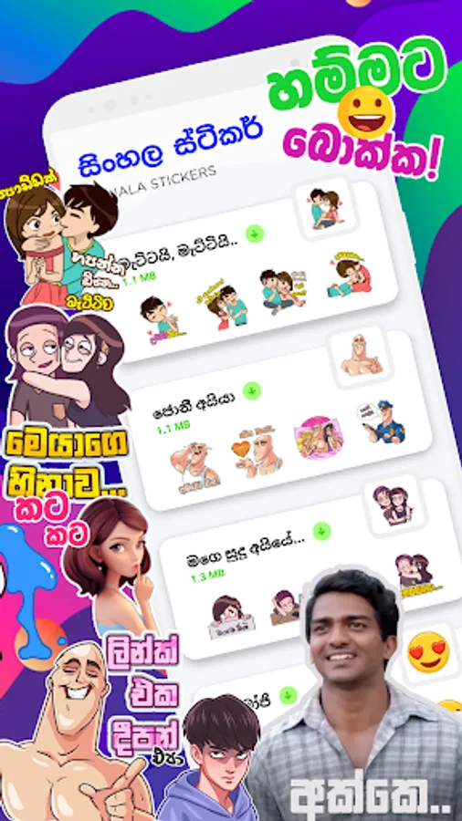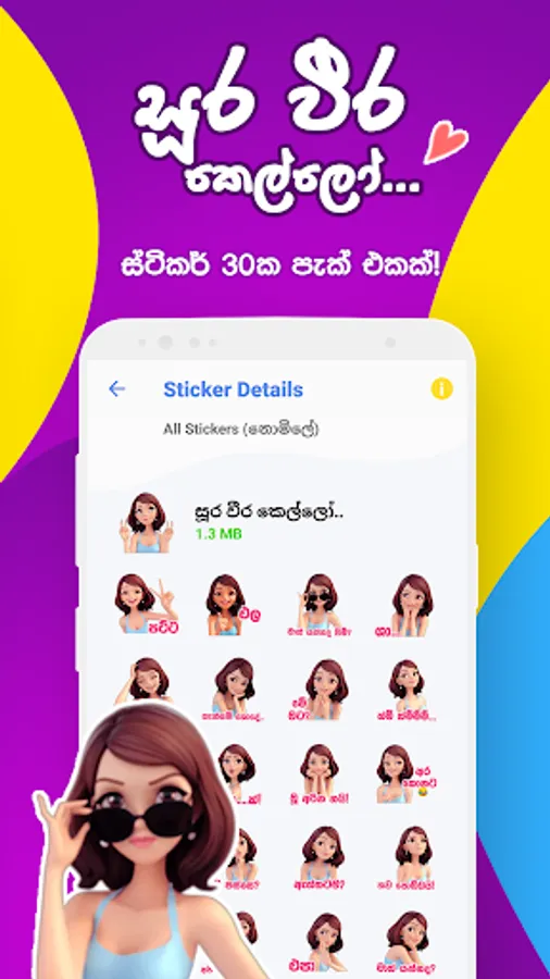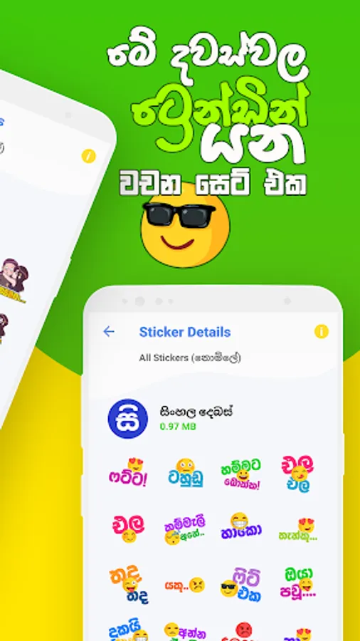 සිංහල වට්ස්ඇප් ස්ටිකර් ඇප් එක පාවිච්චි කරලා ඔයාලා පුලුවන් ඔයාලගේ වට්ස්ඇප් ඇප් එකට සිංහල භෂාවෙන් මේ ඇප් එකේ තියෙන ස්ටිකර් ටිකත් එකතු කරගන්න. මේකෙ දැනට ස්ටිකර් පැක් 12ක් තියෙනවා. ශ්රී ලාංකික වට්ස්ඇප් ස්ටිකර් පාවිච්චි කරලා ඔයාලට පුලුවන් වෙලාවකට වචන වලින් අපිට කියන්න කටට එන්නෙ නැති ආදරනීය හැගීම් ලස්සනම ලස්සන ස්ටිකර්යක් හරහා ප්රකාශ කරන්න. කම්මැලි වෙලාවටත් නියමයි, බොරුවට වචන කර කර ඉන්න ඕනෙත් නැහැනෙ. ඇප් එකේ දැනට ස්ටිකර් පැක් 12 තියෙනවා, ඒවා තමයි තණමල්විල කොල්ලෙක්, මැට්ටයි මැට්ටියි, ජොනී අයියා, මගේ සුදු අයියේ, ඉමෝජි, සිංහල දෙඹස්, සූර වීර කොල්ලෝ, පෙන්ගුයින්, සාන්තගේ සෙට් එක, මීම්ස් සහ ස්වීටි කියන ස්ටිකර් පැක්ස්.