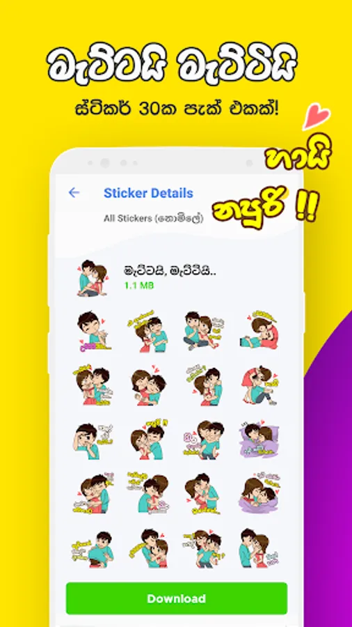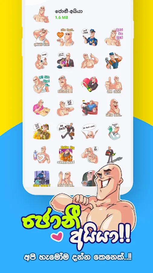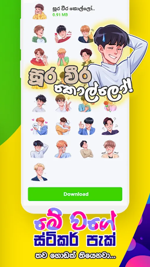 Sinhala WhatsApp Stickers App is for Sri Lankan people who would like to express their lovely feelings throughout the WhatsApp chats by using the Sinhala Stickers instead of words. WhatsApp developers called this type of apps as "WAStickerApps" and they allow users to add custom-designed beautiful sticker packs through 3rd party apps like this. This app contains collections of Sinhala Sticker Packs & these are available only for Sri Lankans. There are almost 12 Funny & Love sticker packs in Sinhala Language and they are: Thanamalvila Kollek, Mettai Metti, Jonny Ayya, Mage Sudu Ayye, Imoji, Sinhala Talks, Sura Veera Kello & Kollo, Penguins, Shantha's Gang, Memes, & Sweety!