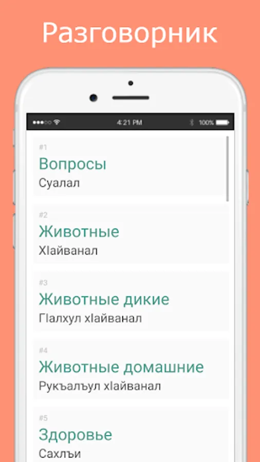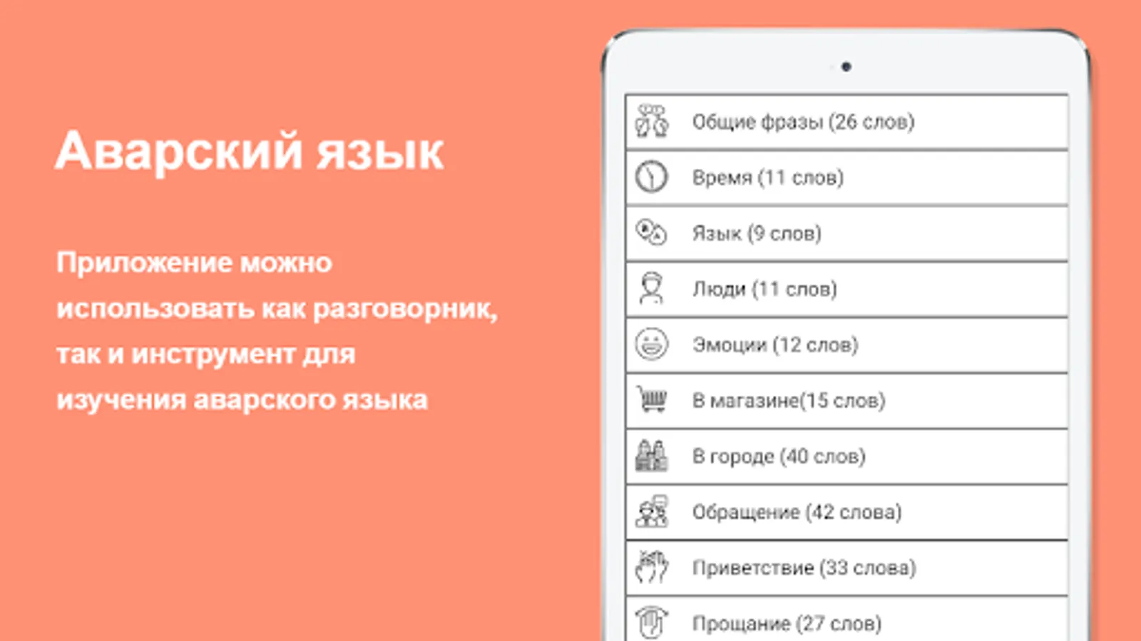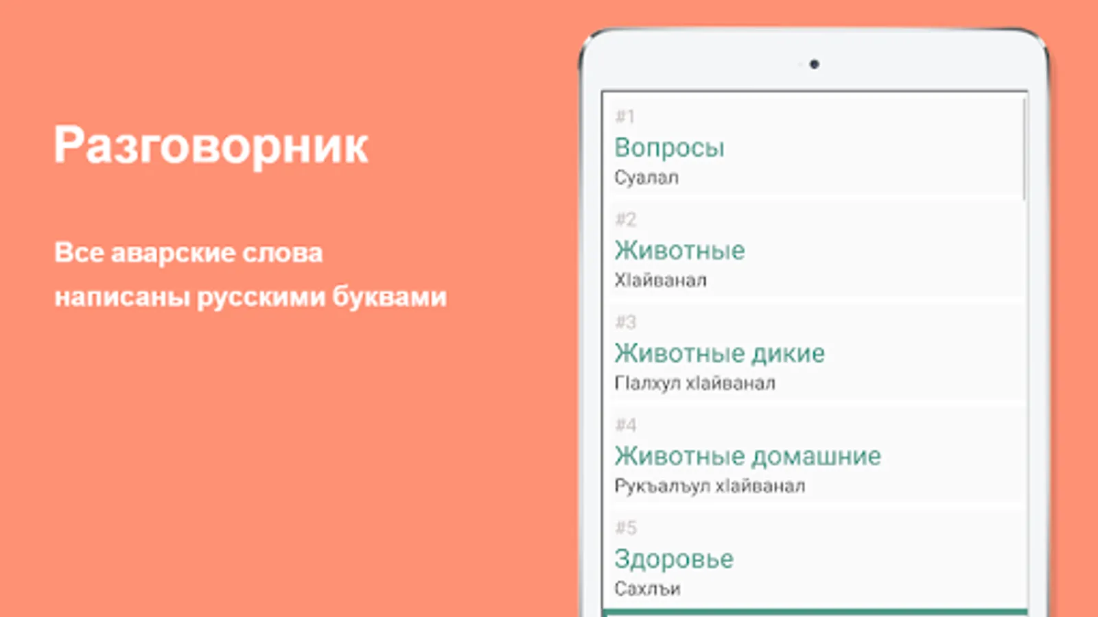 The Russian-Avar phrasebook can be used respectively, both a phrasebook and a tool for learning the Avar language. All Avar words are written in Russian letters and are divided into 11 logical topics, that is, the phrasebook is designed for a Russian-speaking user (tourist).