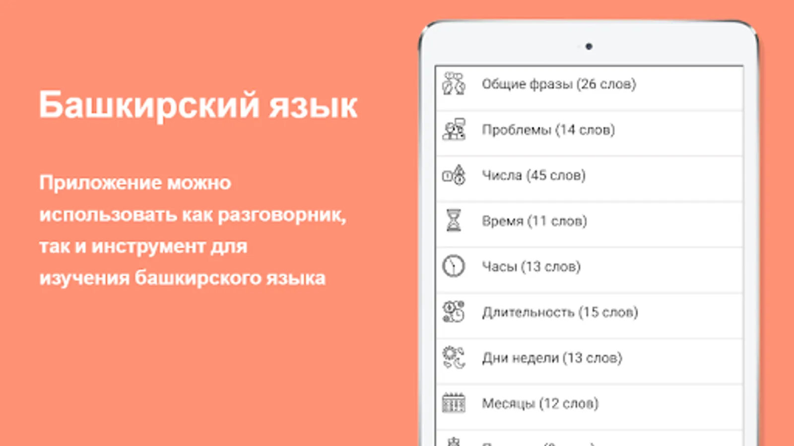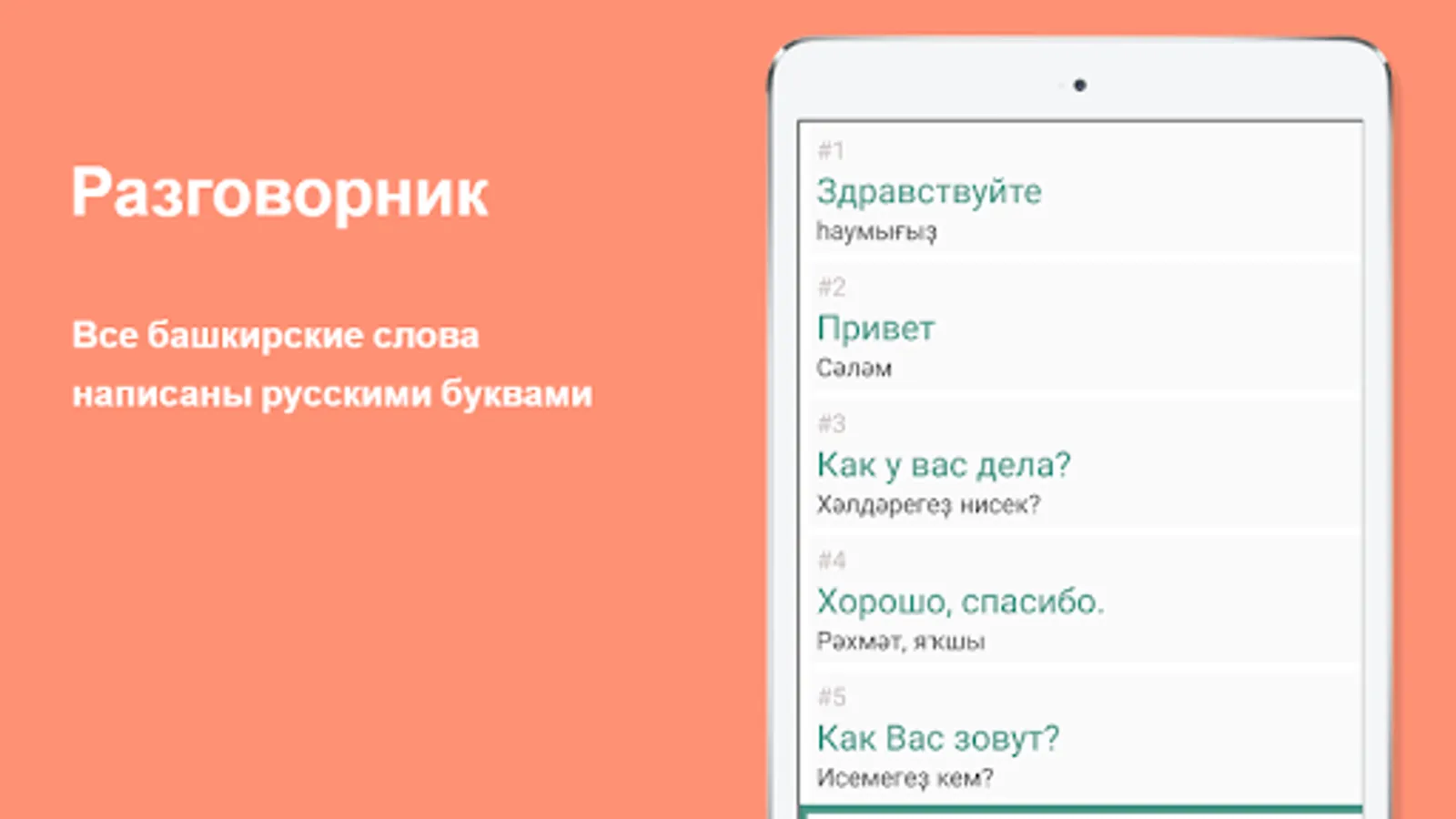 The Russian-Bashkir phrasebook can be used, respectively, as a phrasebook and as a tool for learning the Bashkir language. All Bashkir words are written in Russian letters and are divided into 16 logical topics, that is, the phrasebook is designed for a Russian-speaking user (tourist).