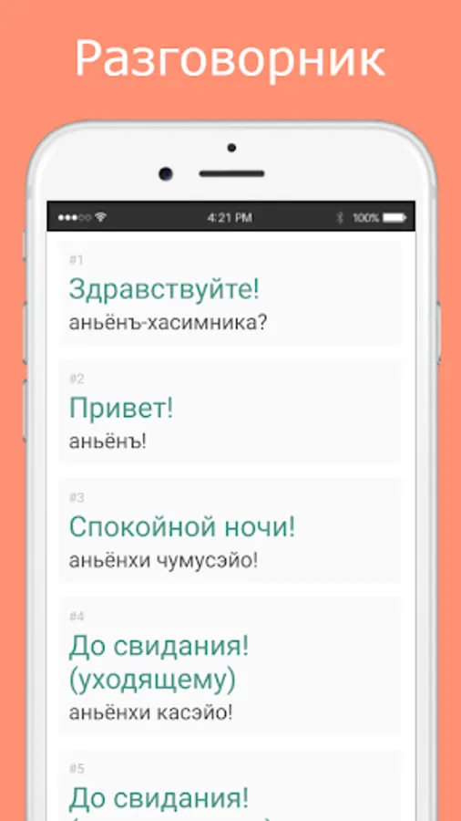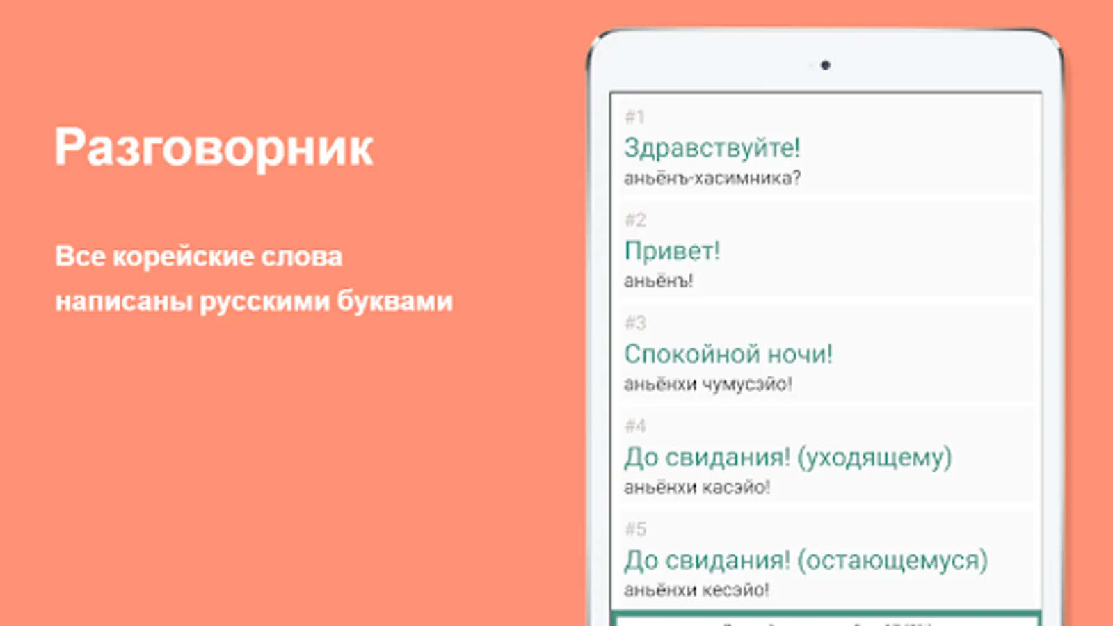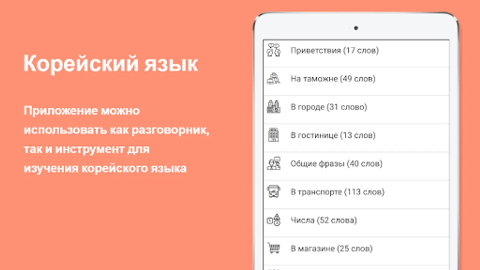 The Russian-Korean phrasebook can be used, respectively, as a phrasebook and a tool for learning the Korean language. All Korean words are written in Russian letters and are divided into 14 logical topics, that is, the phrasebook is designed for a Russian-speaking user (tourist).