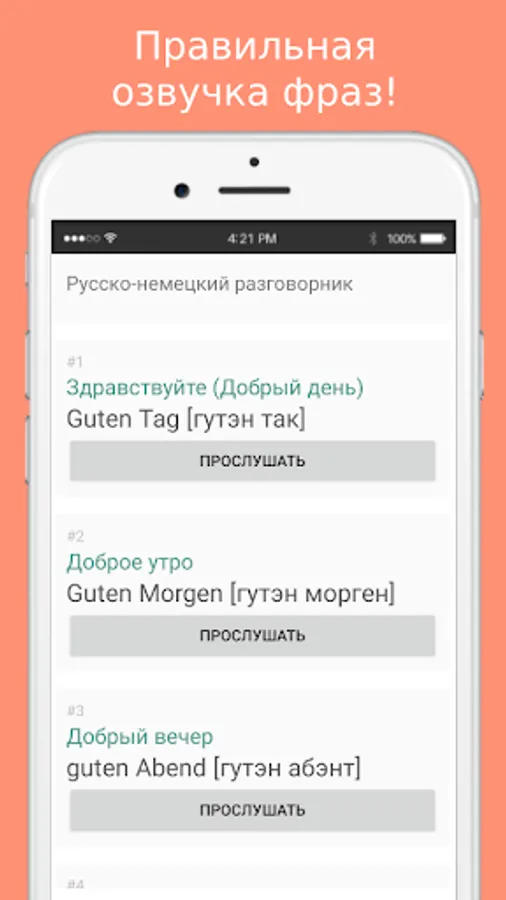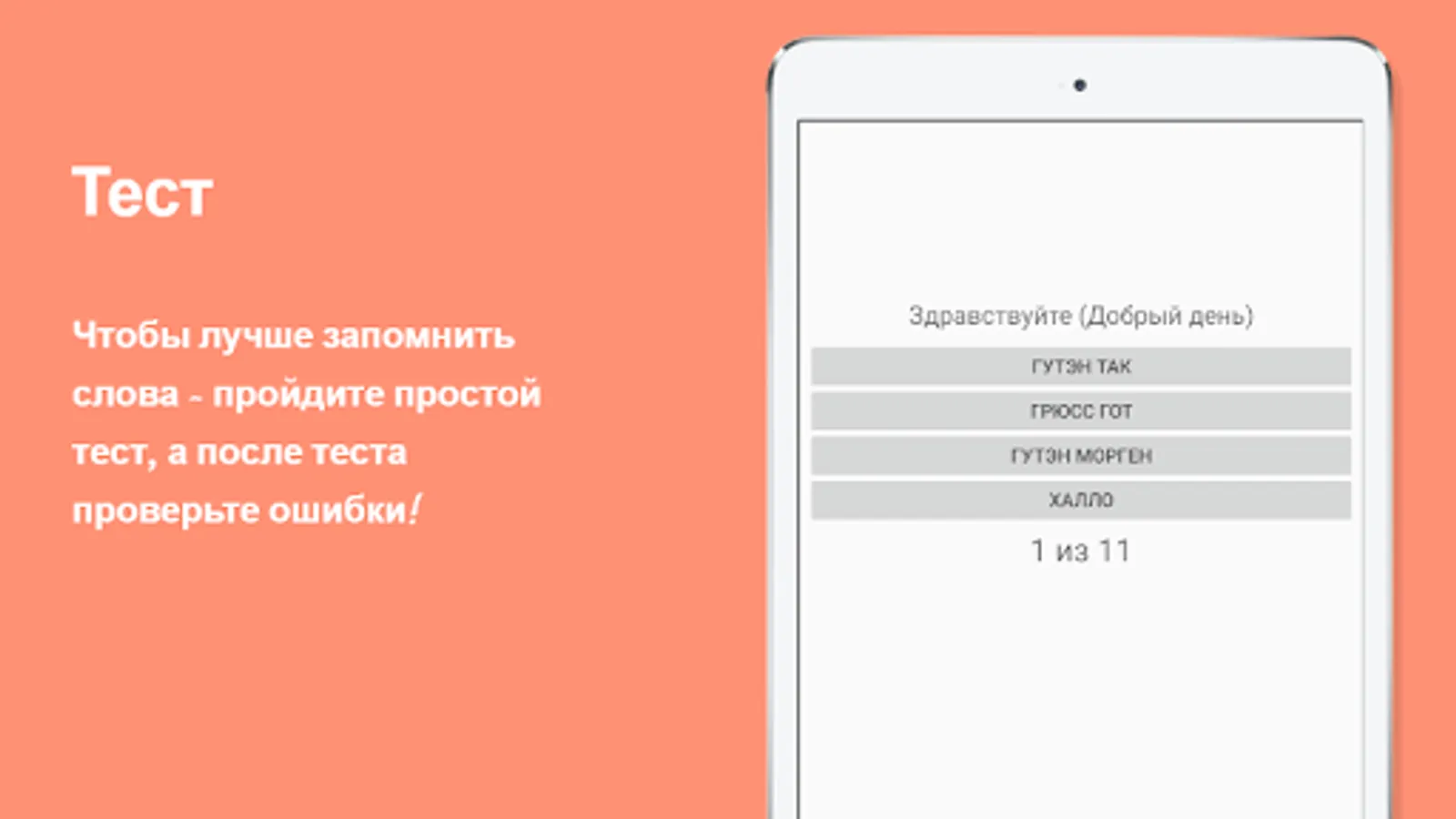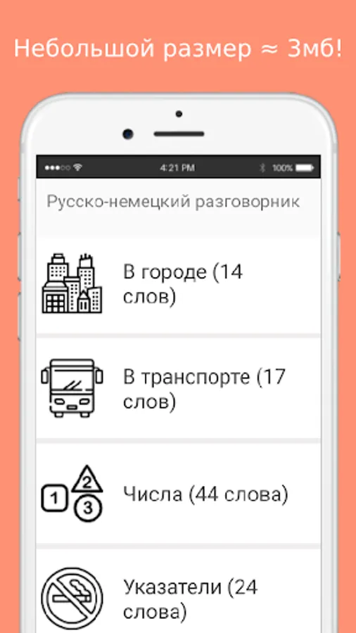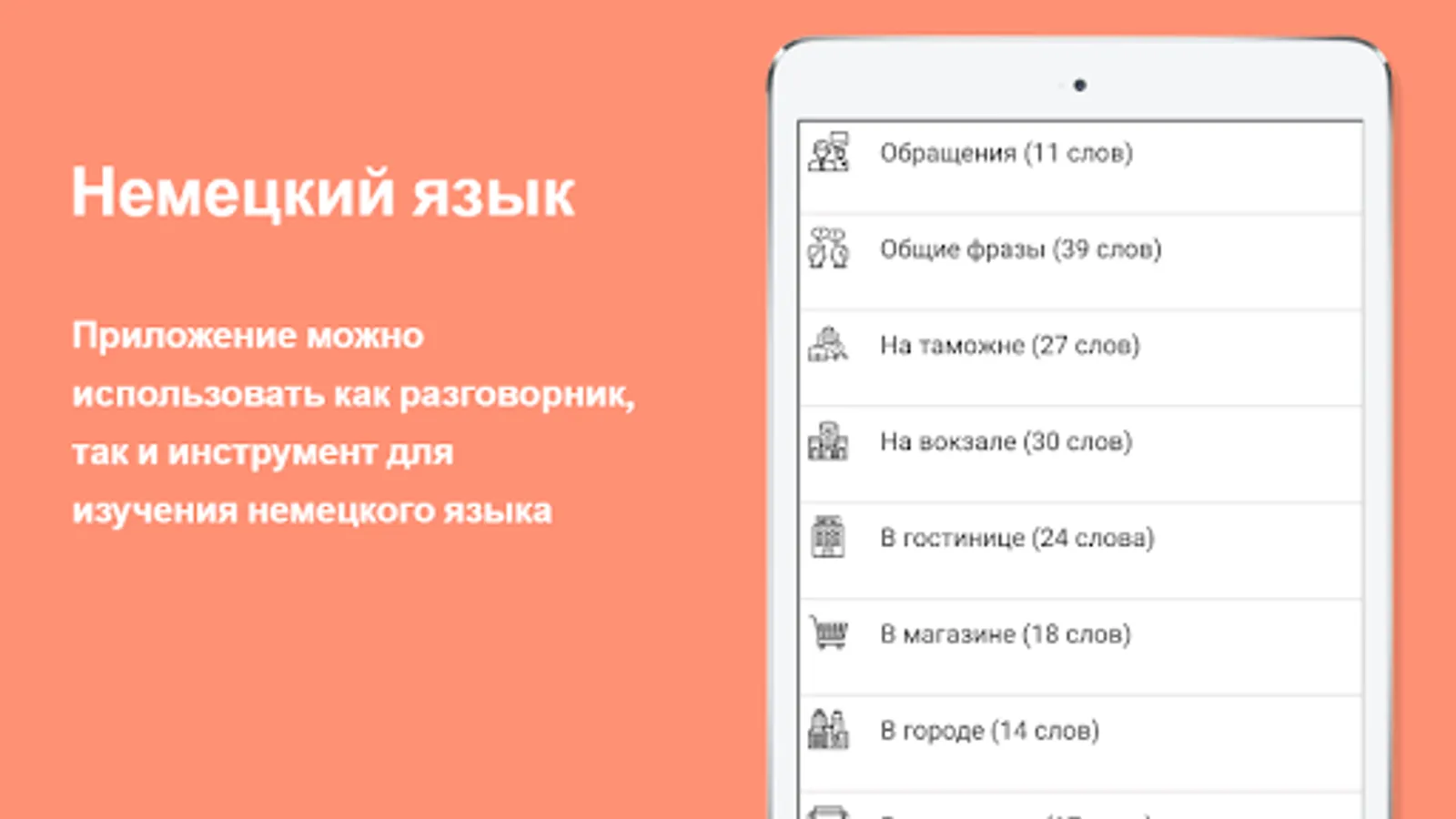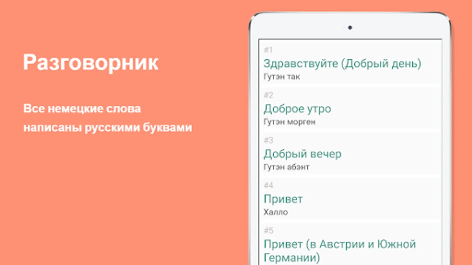 The Russian-German phrasebook can be used, respectively, as a phrasebook and as a tool for learning German. All German words are written in Russian letters and are divided into 10 logical topics, that is, the phrasebook is designed for a Russian-speaking user (tourist).