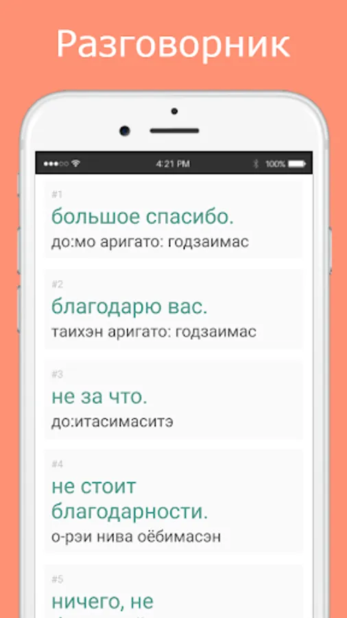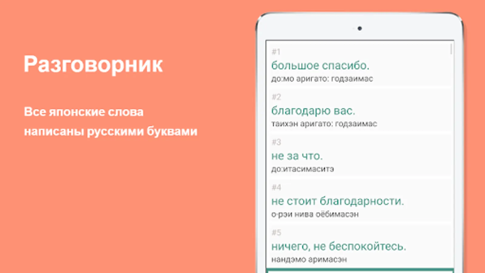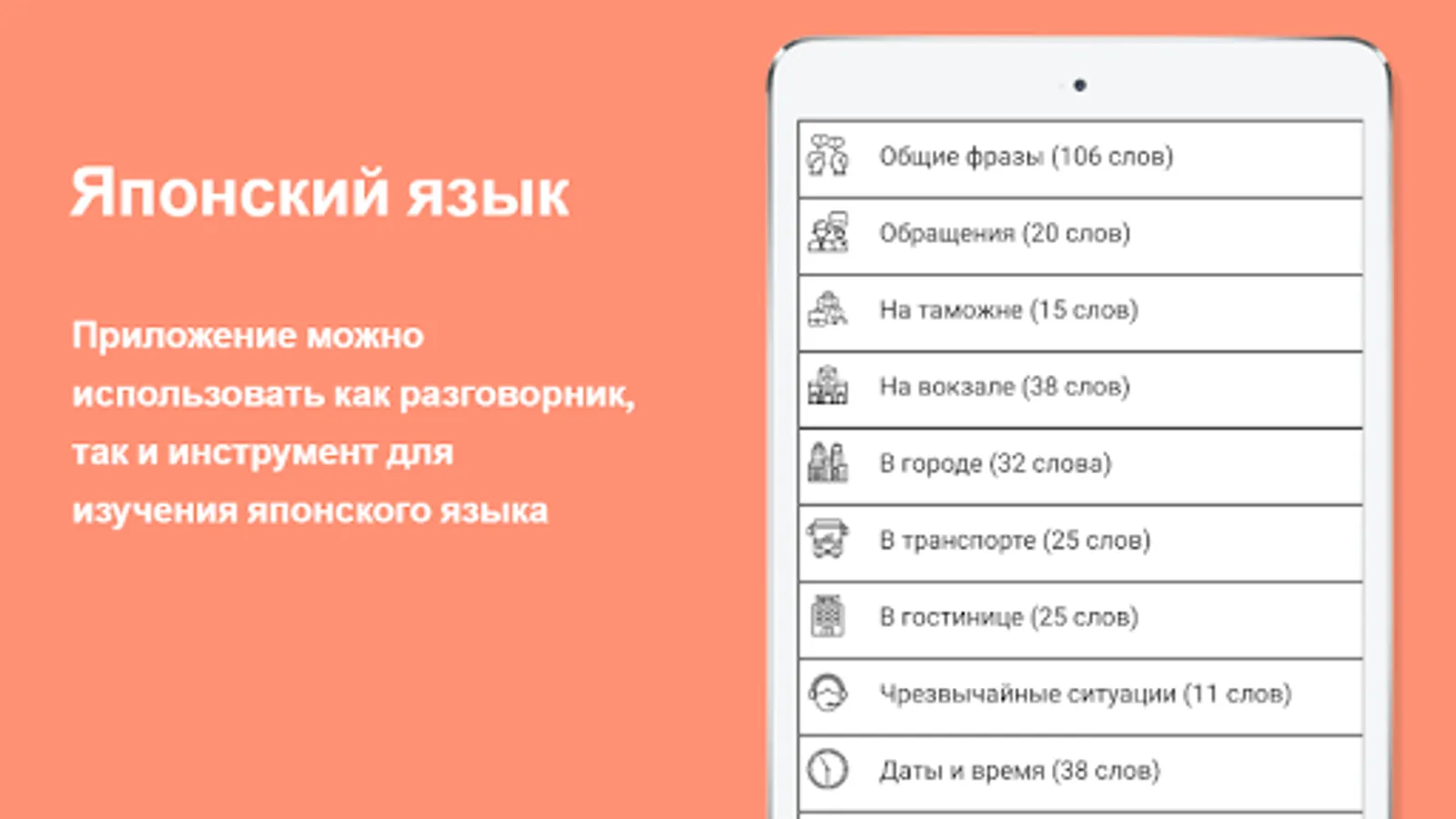 The Russian-Japanese phrasebook can be used, respectively, both a phrasebook and a tool for learning the Japanese language. All Japanese words are written in Russian letters and are divided into 12 logical topics, that is, the phrasebook is designed for a Russian-speaking user (tourist).