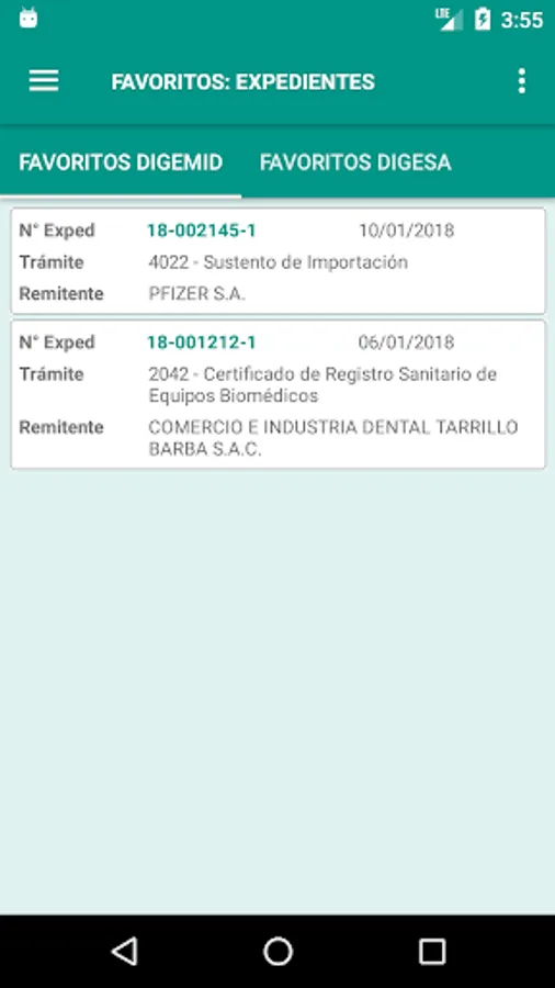The information displayed comes from the consultation to the website of DIGEMID: http://www.digemid.minsa.gob.pe/Expedientes/Default.aspx and DIGESA http://www.digesa.minsa.gob.pe /Expedientes/Consulta_AnexoExpediente.aspx respectively.