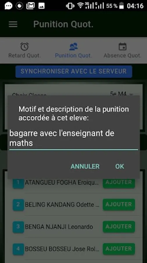 The SGs will take care of the disciplinary aspect, namely the absences, delays and daily punishments of the students so that parents and students are notified immediately that this information is synchronized with the server to be saved.