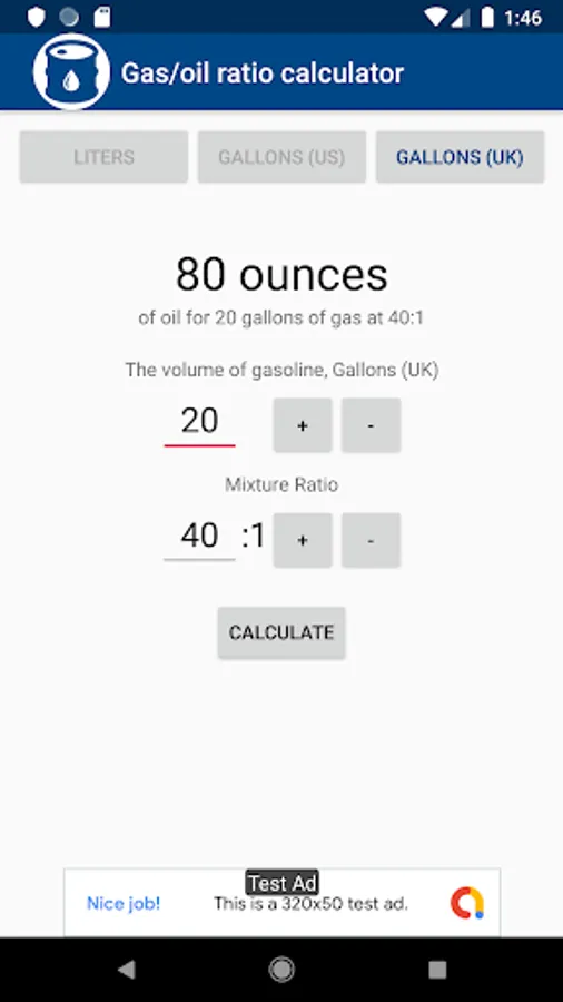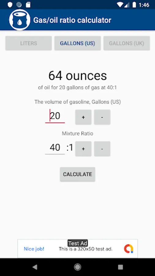 This gas/oil ratio calculator can be used for determining the amount of oil needed for any gas/oil ratio required by the manufacturer's instructions for two-stroke engines.