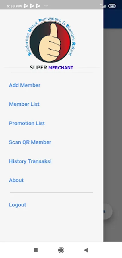 Aplikasi Merchant di gunakan khusus Merchant/ unit dari super sumsel yang sudah terdaftar di super sumsel sebagai merchant yang aktif dimana aplikasi Super Merchant berfungsi membuat member baru dan scan kartu member dan membuat promosi terbaru.