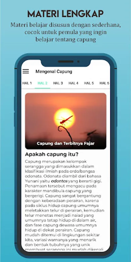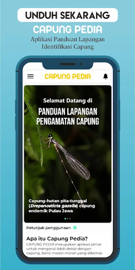 CAPUNG PEDIA is a smart application to get closer to dragonflies, containing material that is packaged in an interesting, easy to understand, and equipped with dragonfly species identification features, evaluation / quiz features and Observation Notes.