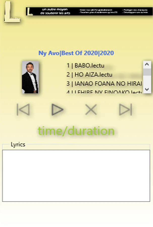 LECTU is a multimedia player, specific for each artist, carrying the songs of a single artist, referring to a well-determined volume of his works. Media files are encoded by LECTU itself, and cannot be played outside of the player, in order to ensure the security of the intellectual property of the artists. LECTU refers to the old "K7" and / or "CD", to distribute the works of the artists, with a vast "free" distribution network, but much more profitable for them. For "LECTU - Ny Avo - Best Of 2020", it provides mobile users with the 10 most listened to songs by Ny Avo, who has chosen LECTU as its main broadcaster.