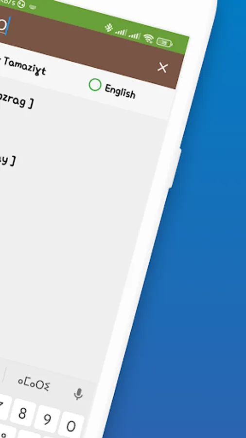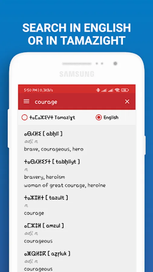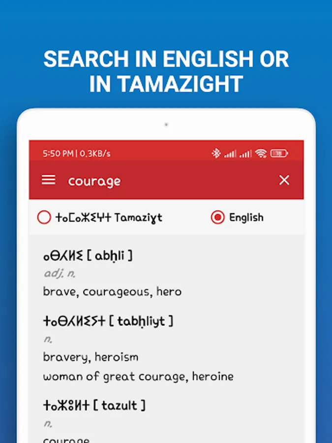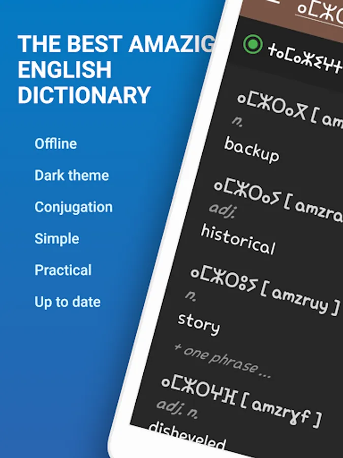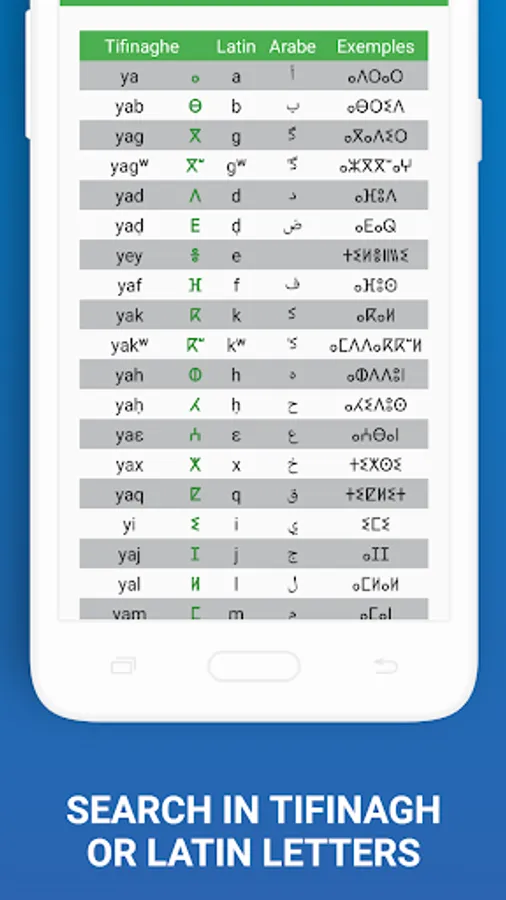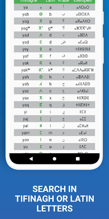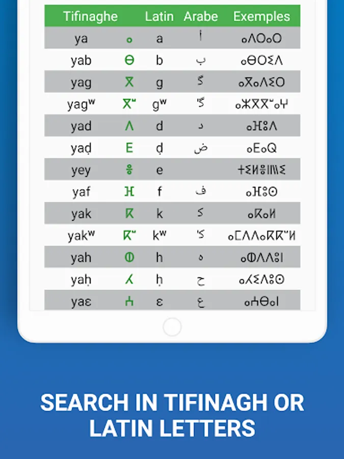 - Practical, the application allows you to search by entering words in tifinaghe, Latin transcription, or English;