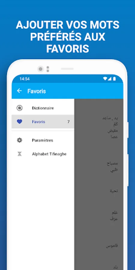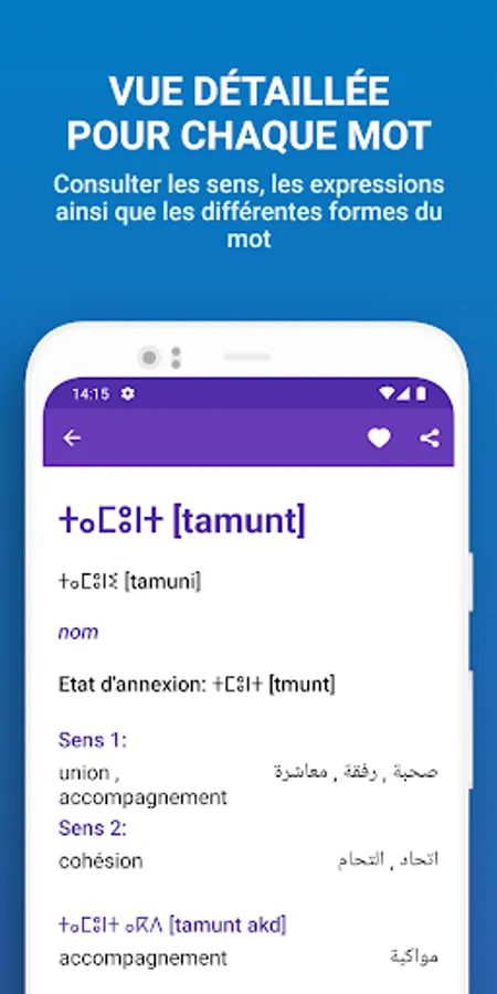 - Practical, the application allows you to do research by entering words in Tifinagh, in Latin transcription, in French or in Arabic;