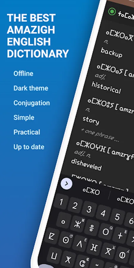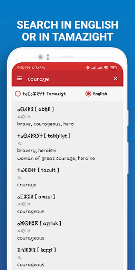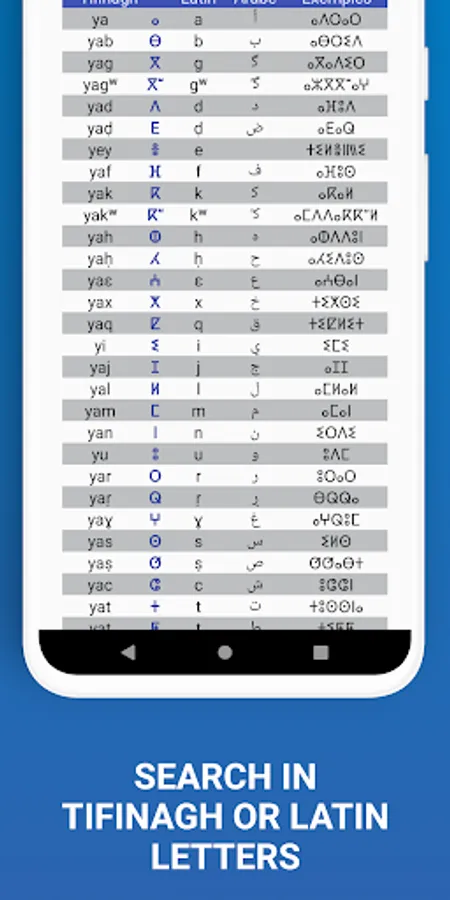 - Practical, the application allows you to search by entering words in tifinaghe, Latin transcription, or English;