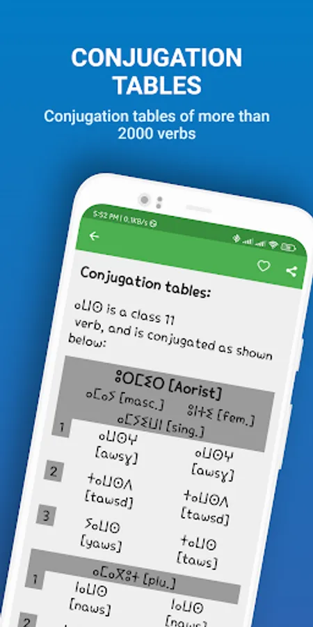 - Conjugation tables of nearly 2000 verbs;