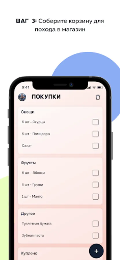 When we are done with meal planning, we start making a shopping list. When we define the dishes that we plan to cook, the Plate automatically makes a list of necessary products from the ingredients of the dishes. This saves us from having to remember or write down all the products we need to buy. We can just look at the shopping list in the app and be sure that we won't forget anything when we go to the store.