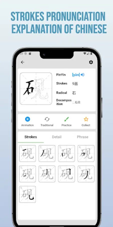 Comprehensive functions: stroke animations, pinyin, radicals, structure, meanings, Chinese language, phrases, idioms, and traditional Chinese characters are all covered.
