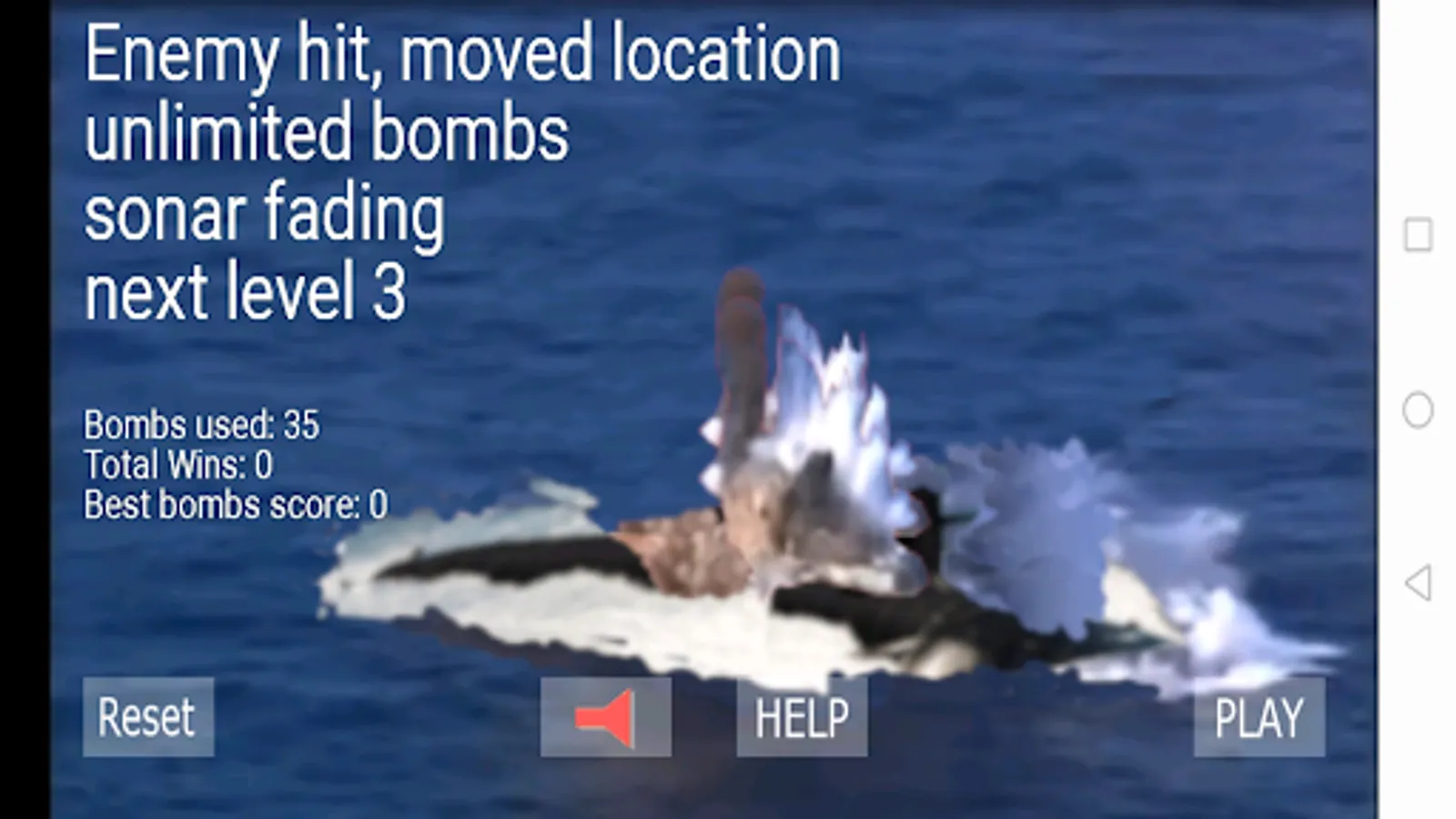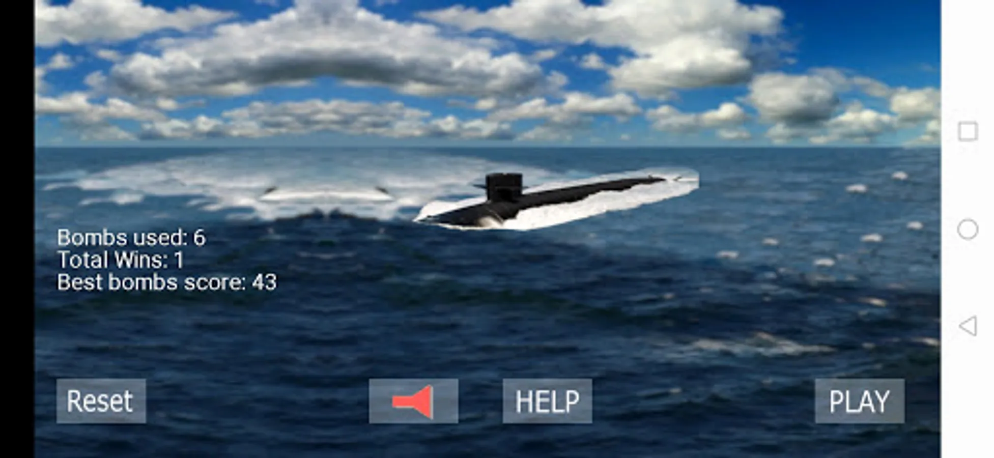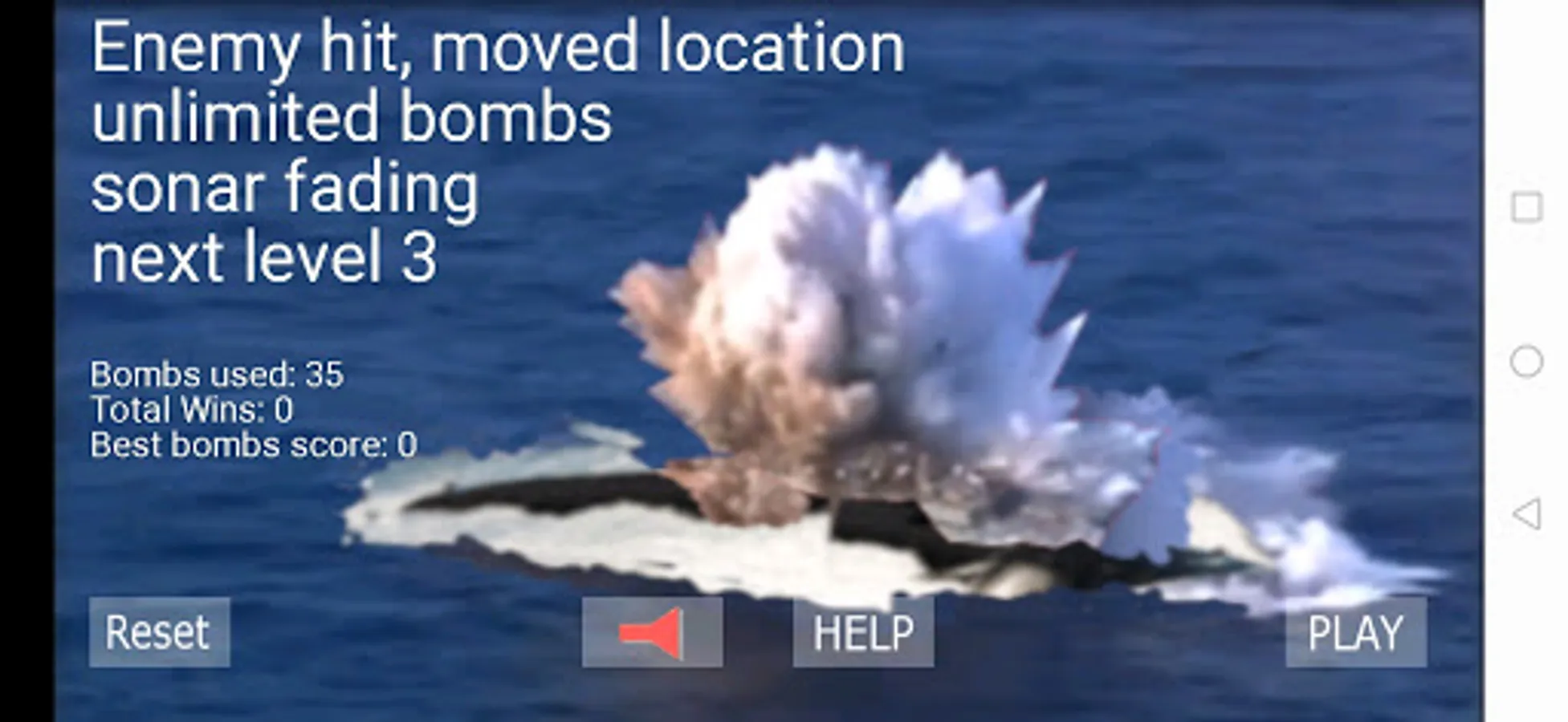Enemy lurking beneath the ocean, in one of the grid squares; tap a grid location to drop a bomb on the enemy; if you miss the target, the sonar reveals potential location on the last outer periphery. Whenever the enemy is hit, you move through the levels, with increasing difficulty: sonar fading or breaking, enemy relocating, and limited fire. In each new level, the enemy relocates to a new stationary position, but from level 6, it starts relocating within the same level as well.