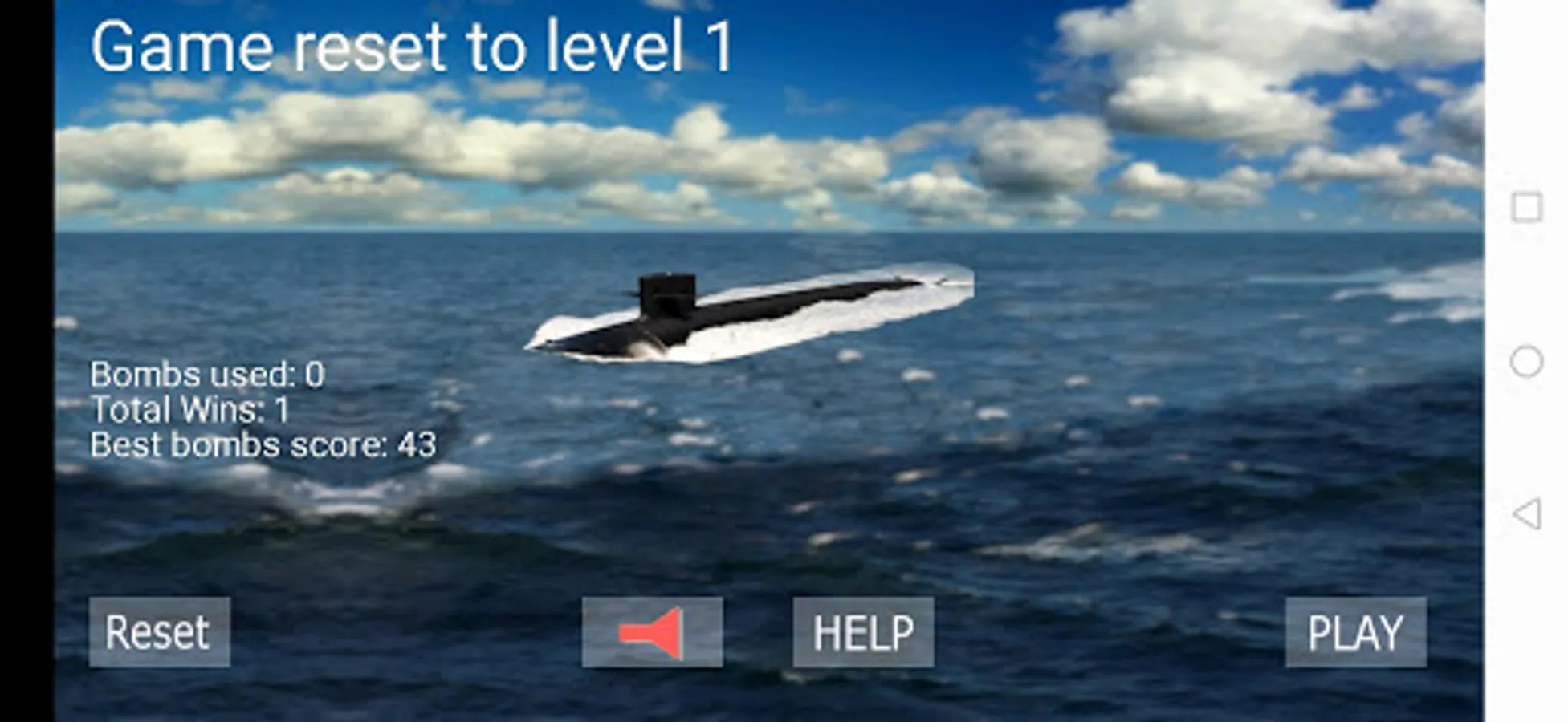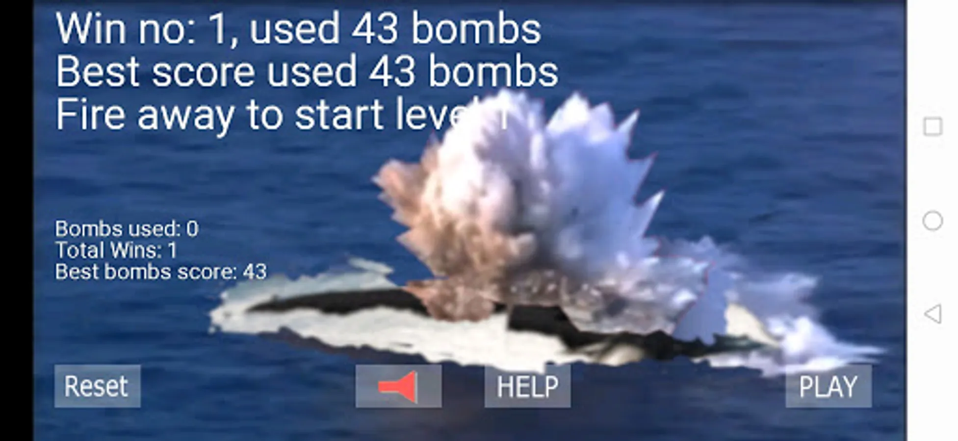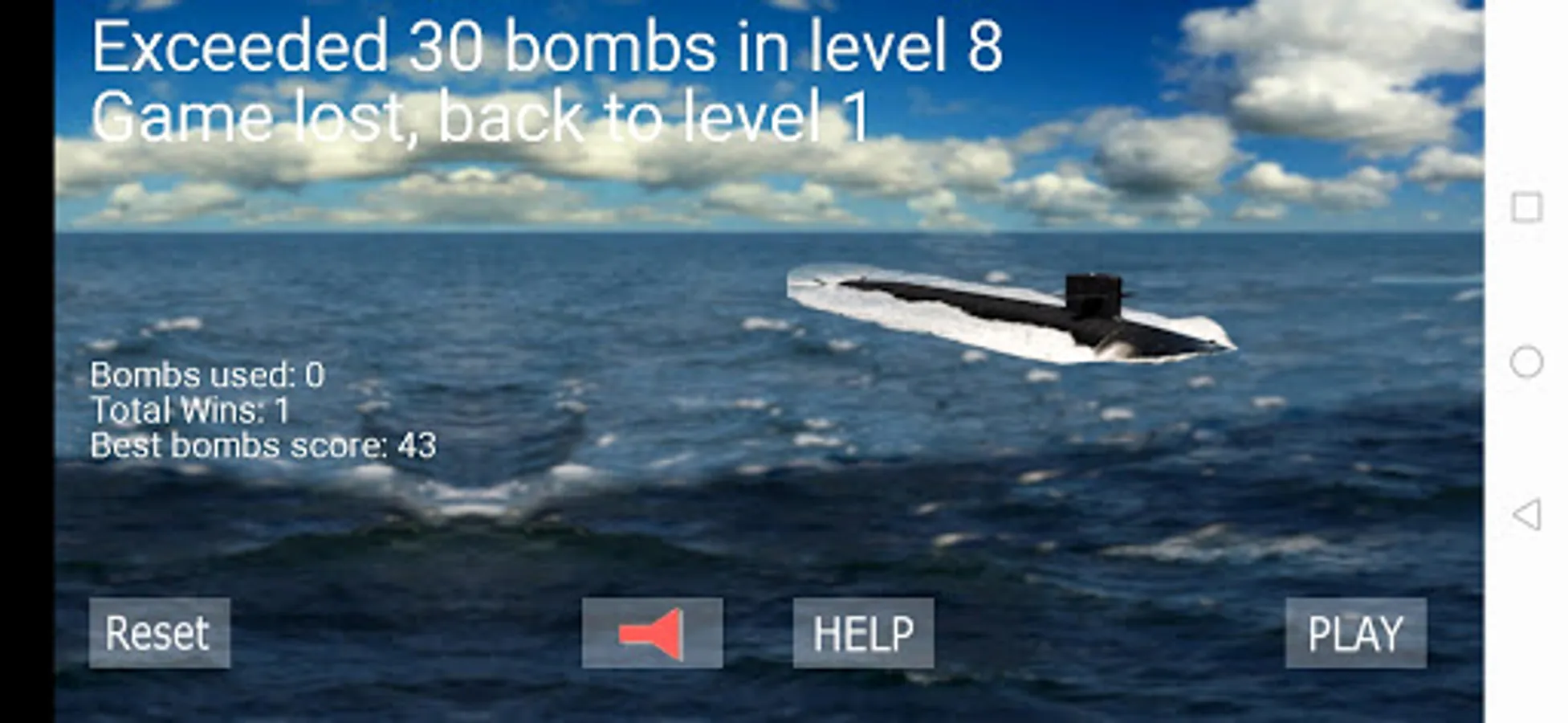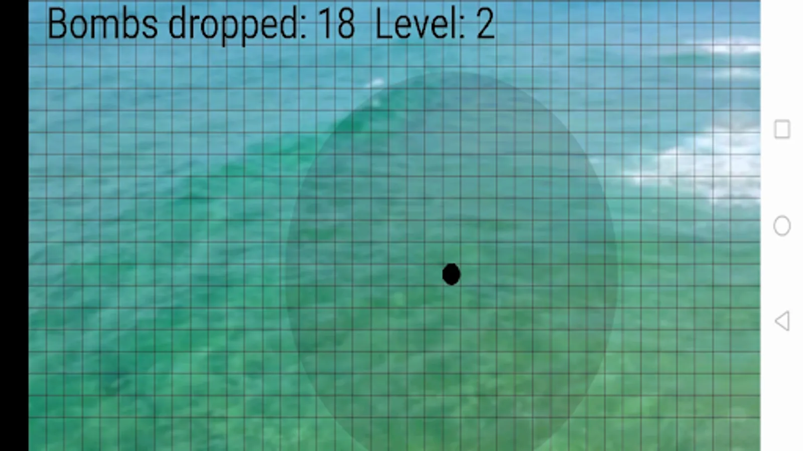 Enemy lurking beneath the ocean, in one of the grid squares; tap a grid location to drop a bomb on the enemy; if you miss the target, the sonar reveals potential location on the last outer periphery. Whenever the enemy is hit, you move through the levels, with increasing difficulty: sonar fading or breaking, enemy relocating, and limited fire. In each new level, the enemy relocates to a new stationary position, but from level 6, it starts relocating within the same level as well.