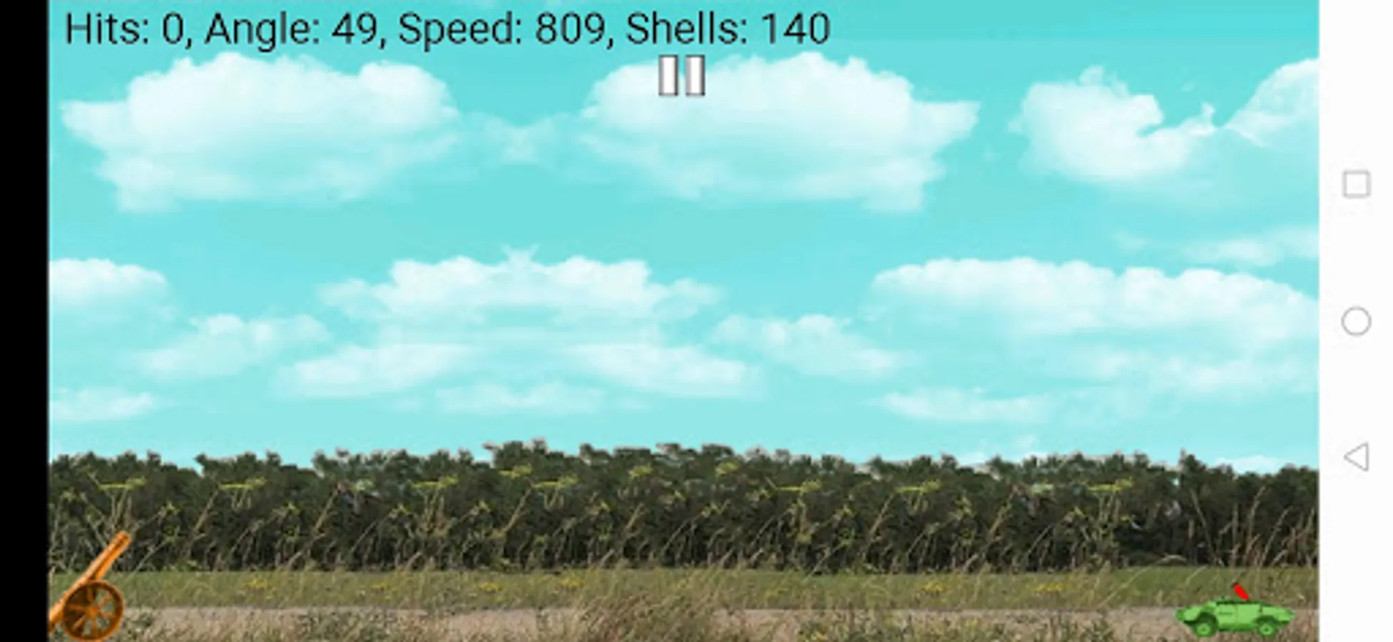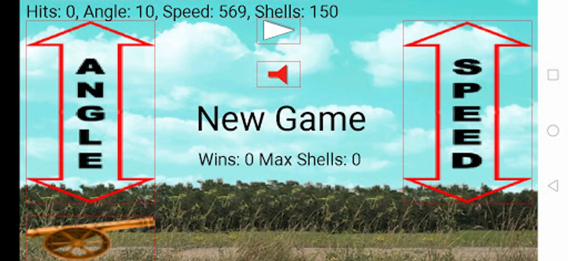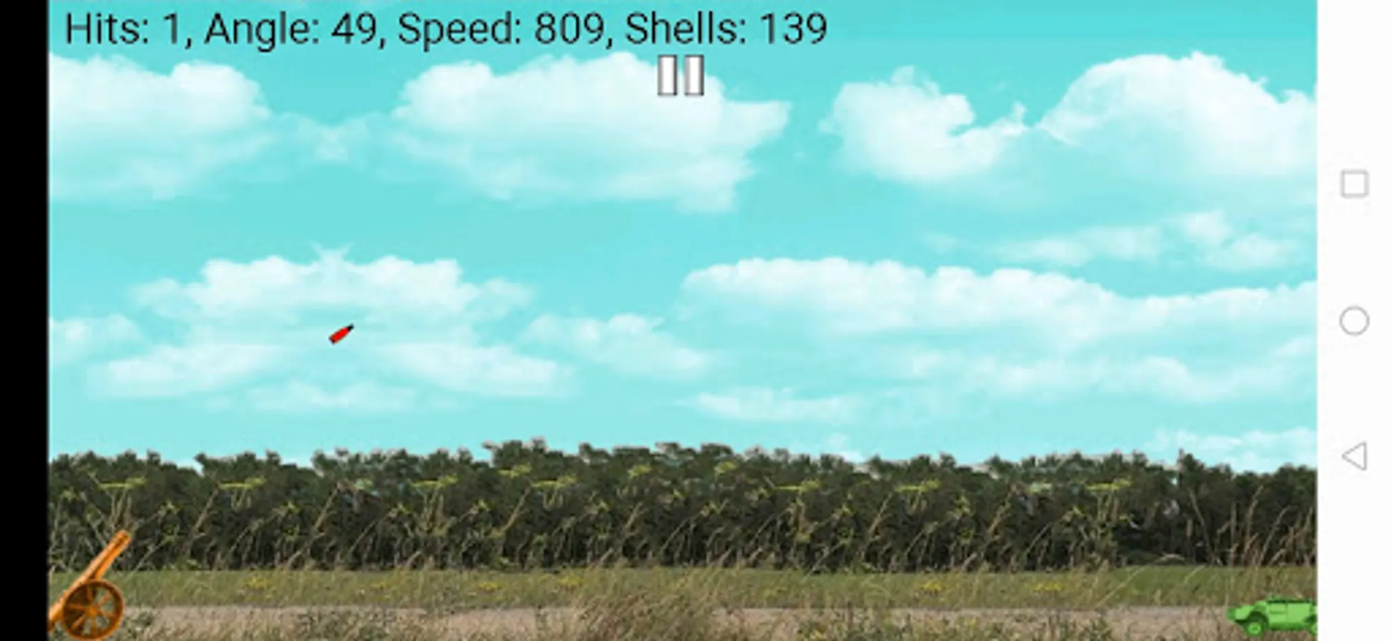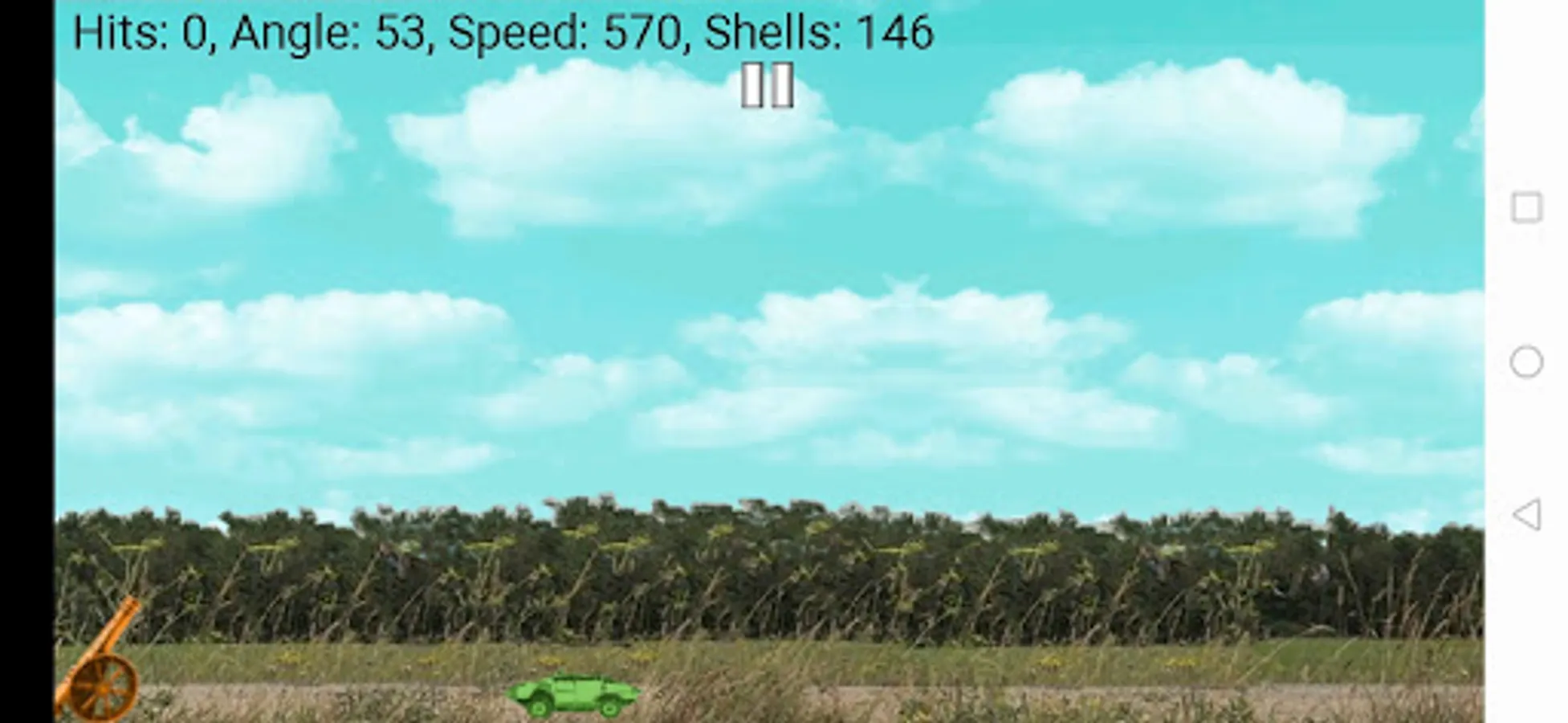Cannon shell fire. Aim cannon, set shell speed then fire. Upon firing, the enemy will start travelling towards the cannon. You must hit the enemy before the cannon is rammed by the enemy vehicle, which doesn't have fire power. If you miss the target, adjust angle and speed then fire again before the cannon is rammed. You cannot fire another shell not until the shell hits the ground or the enemy; the enemy can start off screen in which case you are making a blind shot. Shell trajectory is governed by regular physics: initial shell speed, angle of fire and gravity, neglecting wind effect. Speed and angle controls can be set by either touching or sliding fingers in the respective control areas. You fire by touching the cannon. Randomly the enemy activates evasion mechanism, in which case you must approach the target from a high angle, putting the shell in the enemy's radar blind spot. Hitting the enemy wins a point and ramming the cannon loses a point. To win the game you must reach 10 points with a set of 150 shells.