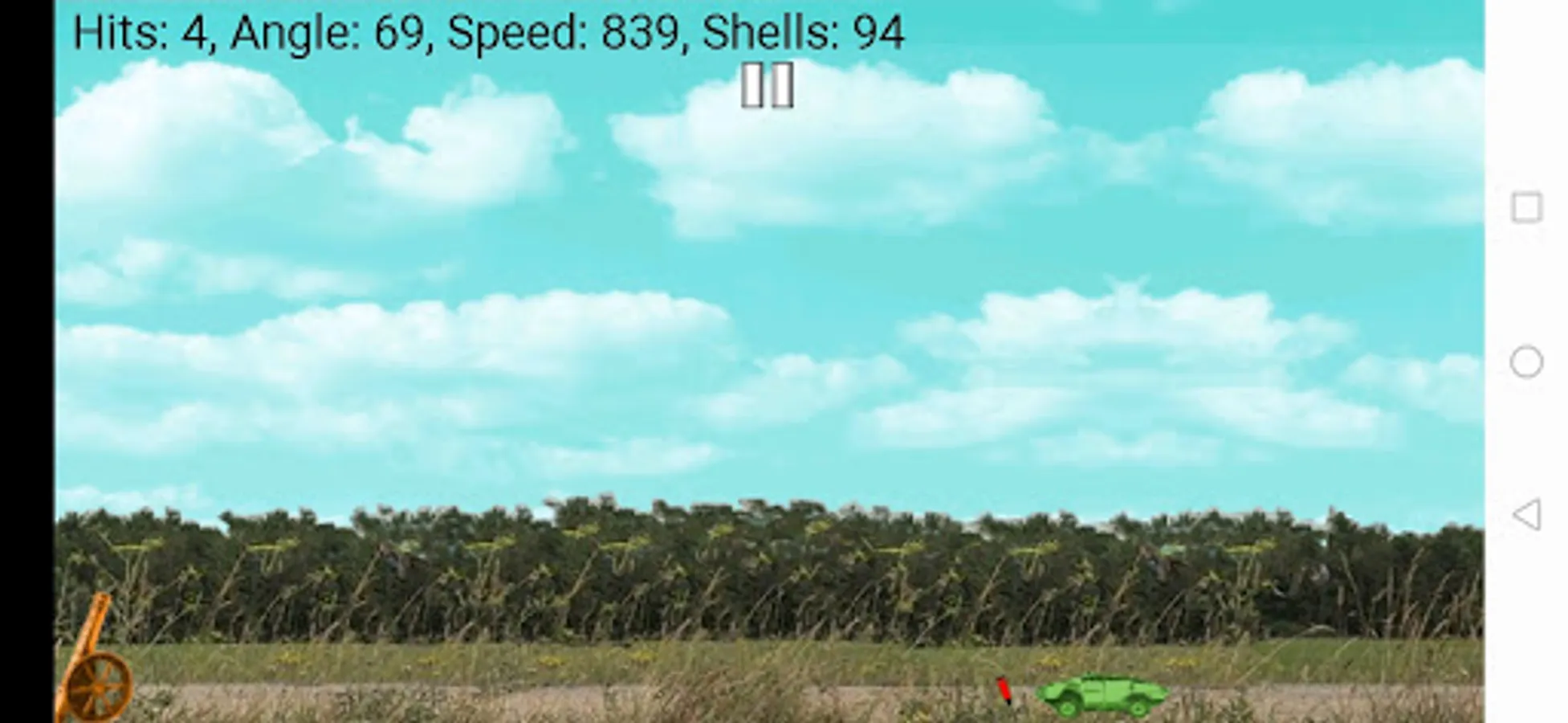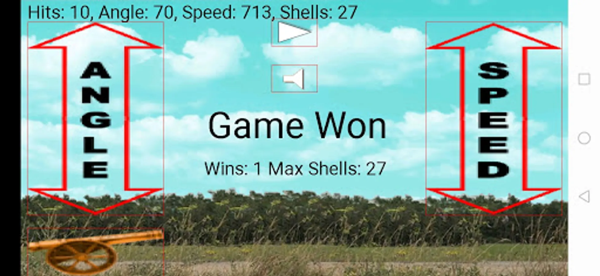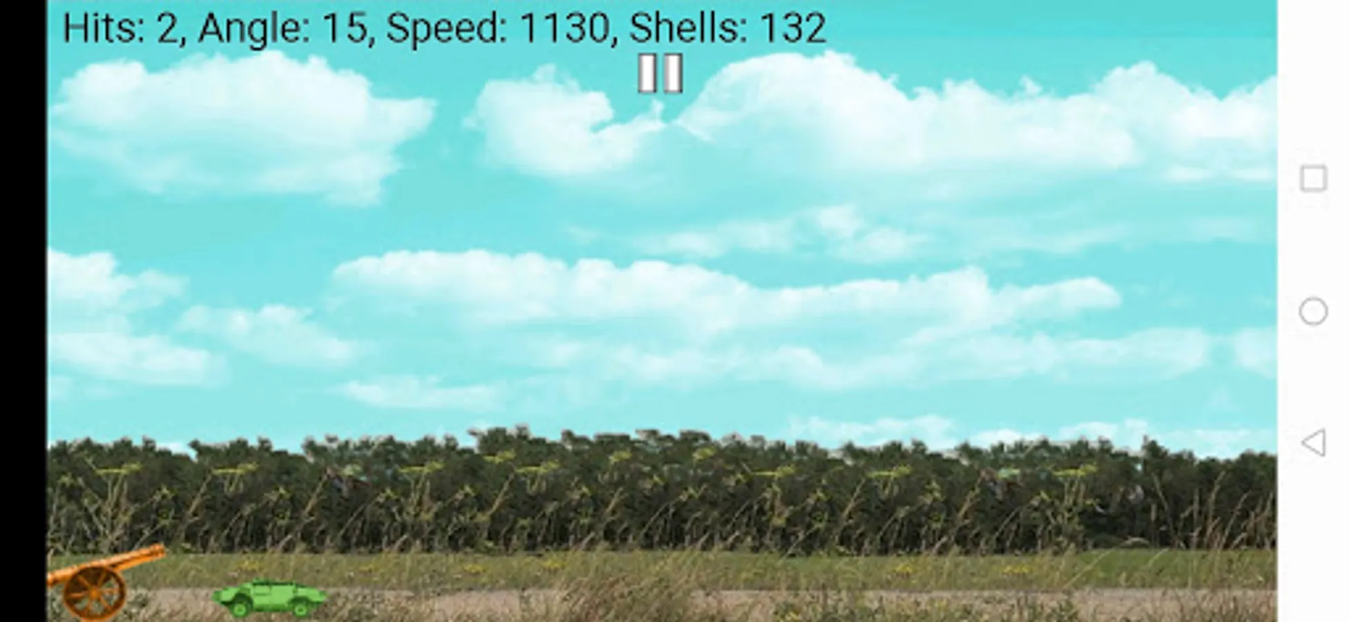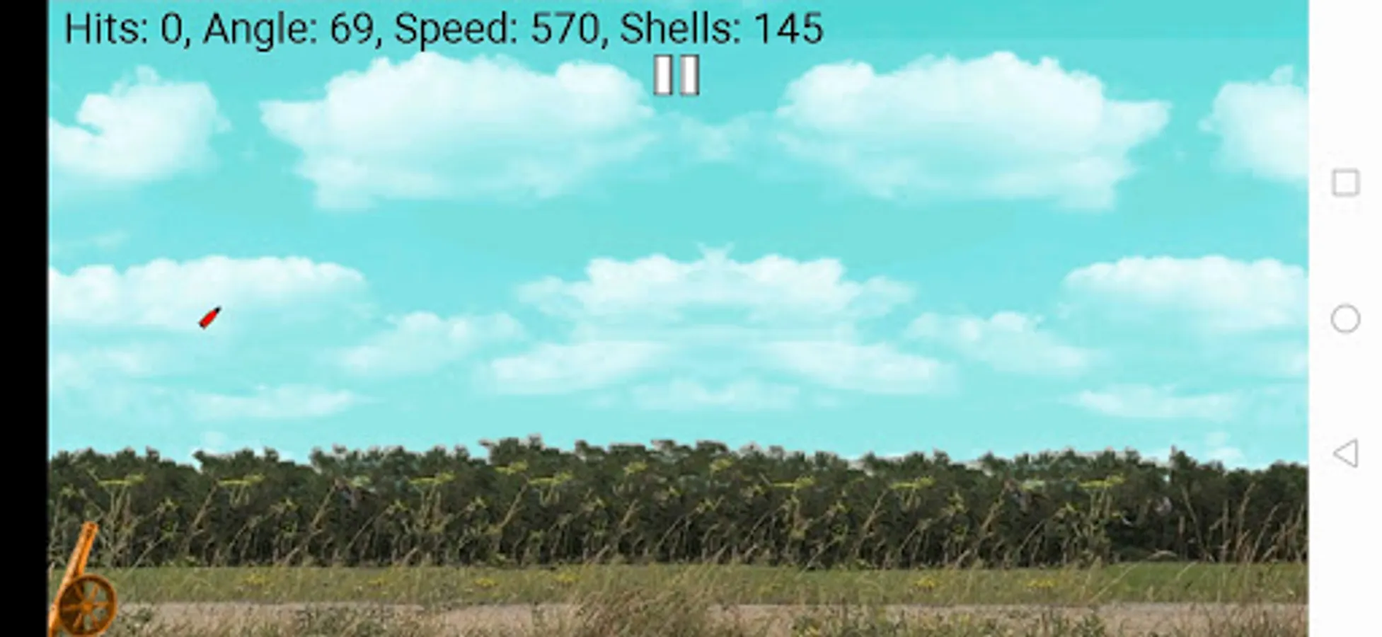 Cannon shell fire. Aim cannon, set shell speed then fire. Upon firing, the enemy will start travelling towards the cannon. You must hit the enemy before the cannon is rammed by the enemy vehicle, which doesn't have fire power. If you miss the target, adjust angle and speed then fire again before the cannon is rammed. You cannot fire another shell not until the shell hits the ground or the enemy; the enemy can start off screen in which case you are making a blind shot. Shell trajectory is governed by regular physics: initial shell speed, angle of fire and gravity, neglecting wind effect. Speed and angle controls can be set by either touching or sliding fingers in the respective control areas. You fire by touching the cannon. Randomly the enemy activates evasion mechanism, in which case you must approach the target from a high angle, putting the shell in the enemy's radar blind spot. Hitting the enemy wins a point and ramming the cannon loses a point. To win the game you must reach 10 points with a set of 150 shells.