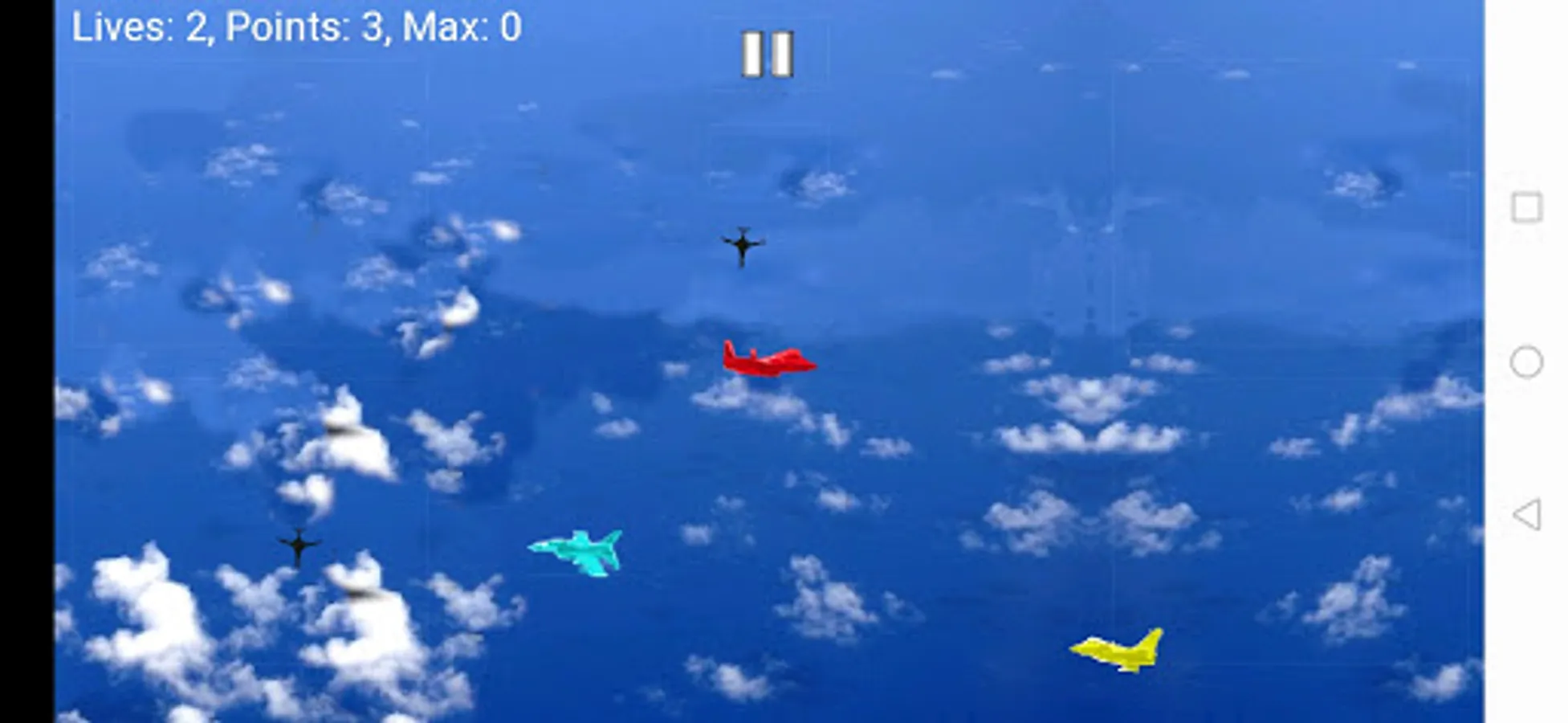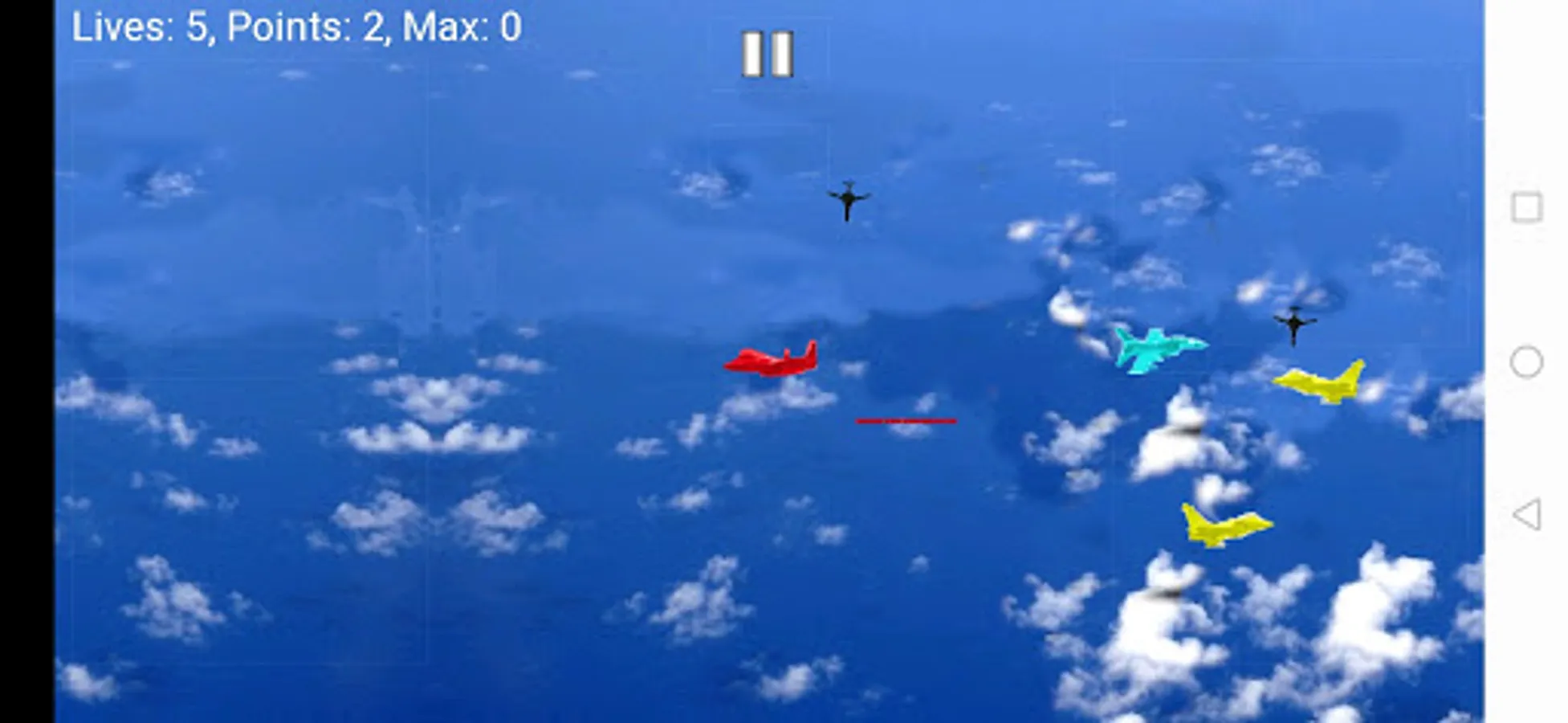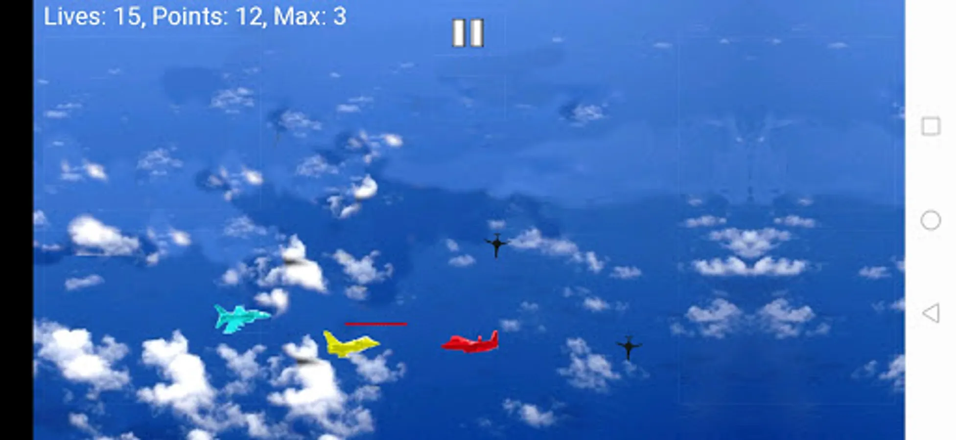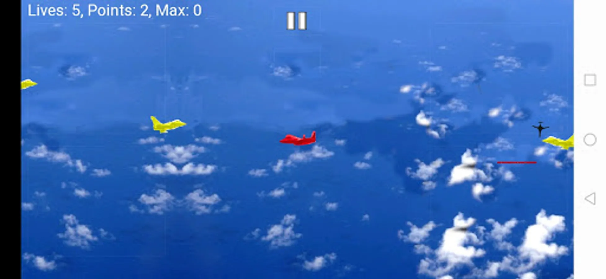 Fighter planes shootout in the sky. Player's plane in red color, can flip direction, fire instantly and can move up and down across the sky. Player has more fire power than the enemy. Several enemy planes hunt the player: black planes don't have fire power but will randomly drop in the sky with risk of hitting the player; cyan planes will hunt the player and randomly fire when within range of player's altitude and distance; yellow planes will wander in the sky and can fire at the player as well when within range.