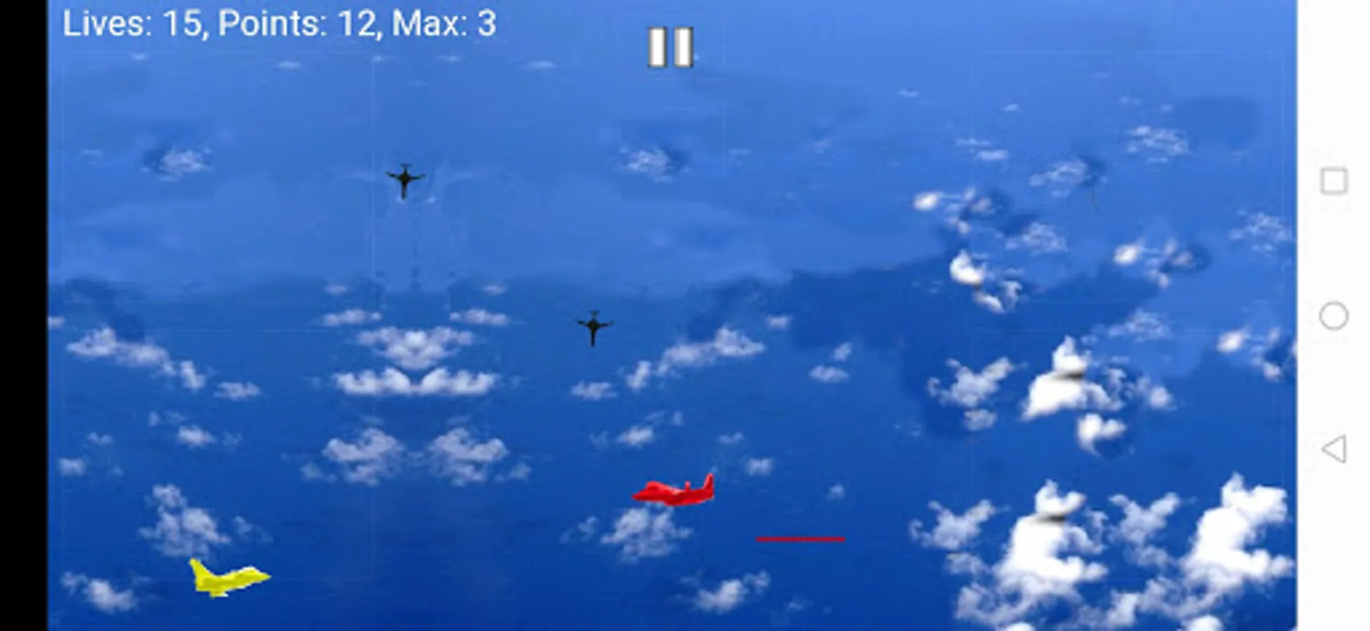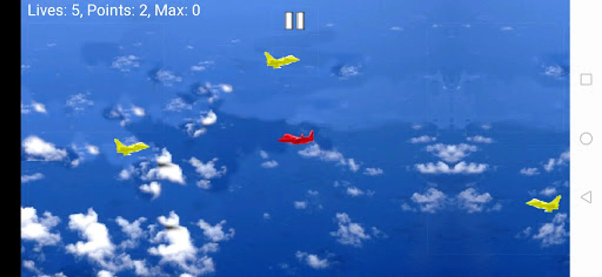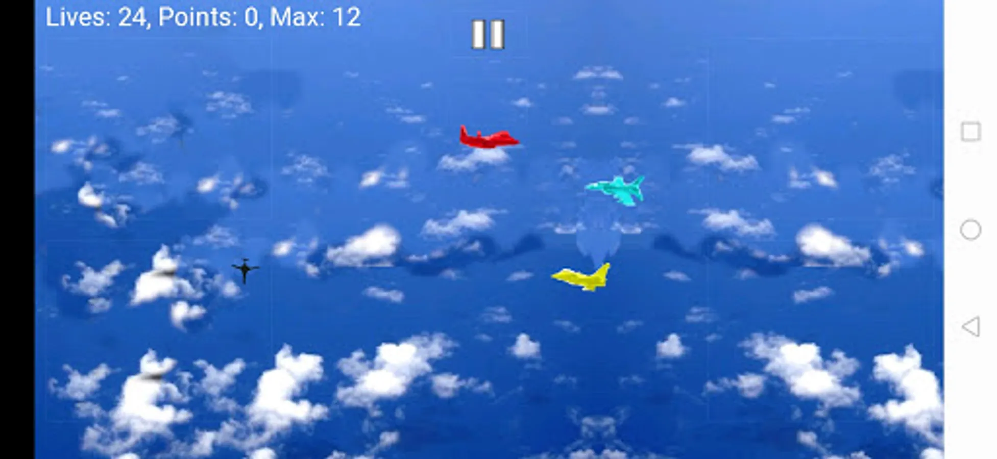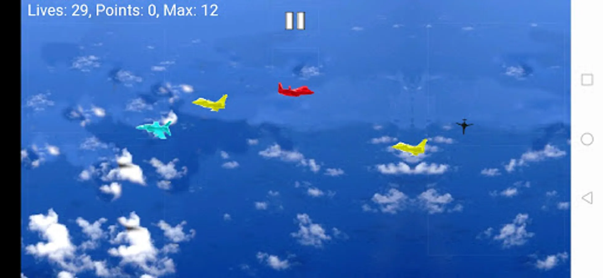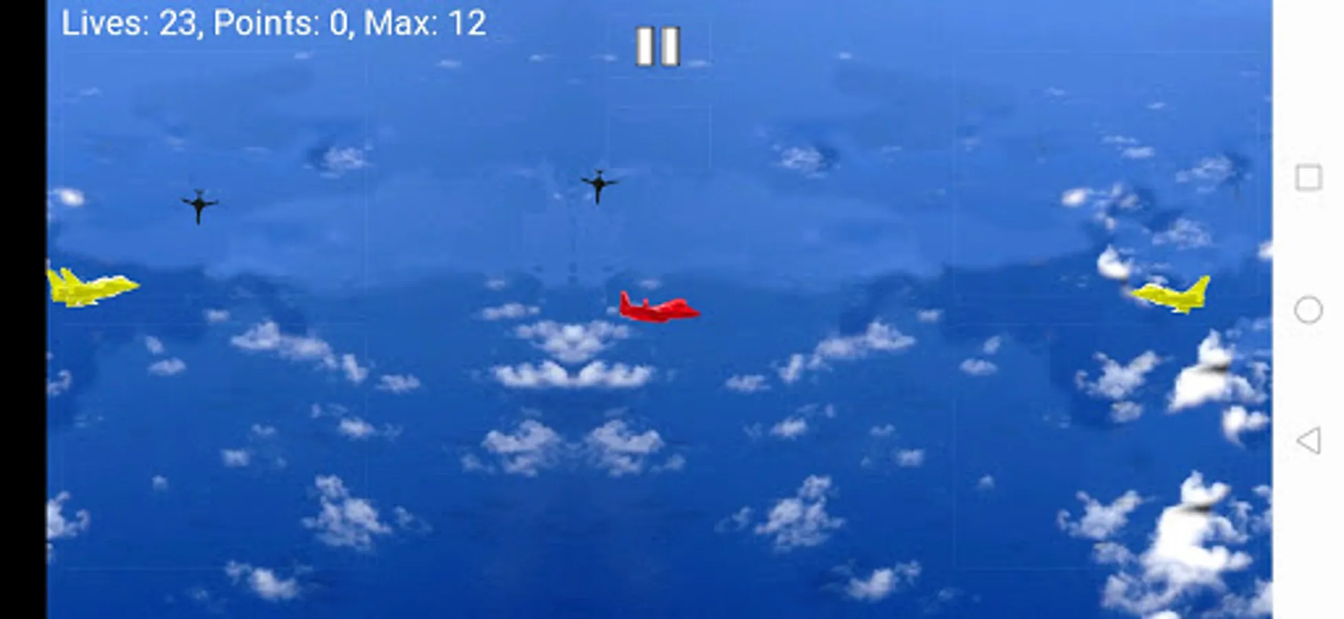 Fighter planes shootout in the sky. Player's plane in red color, can flip direction, fire instantly and can move up and down across the sky. Player has more fire power than the enemy. Several enemy planes hunt the player: black planes don't have fire power but will randomly drop in the sky with risk of hitting the player; cyan planes will hunt the player and randomly fire when within range of player's altitude and distance; yellow planes will wander in the sky and can fire at the player as well when within range.