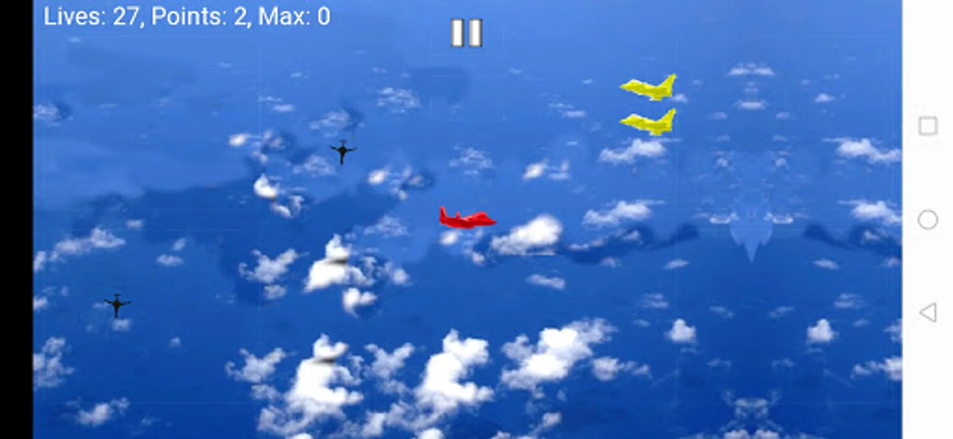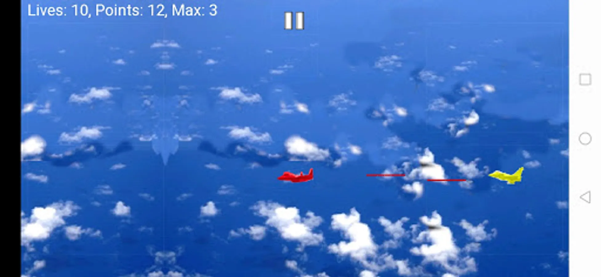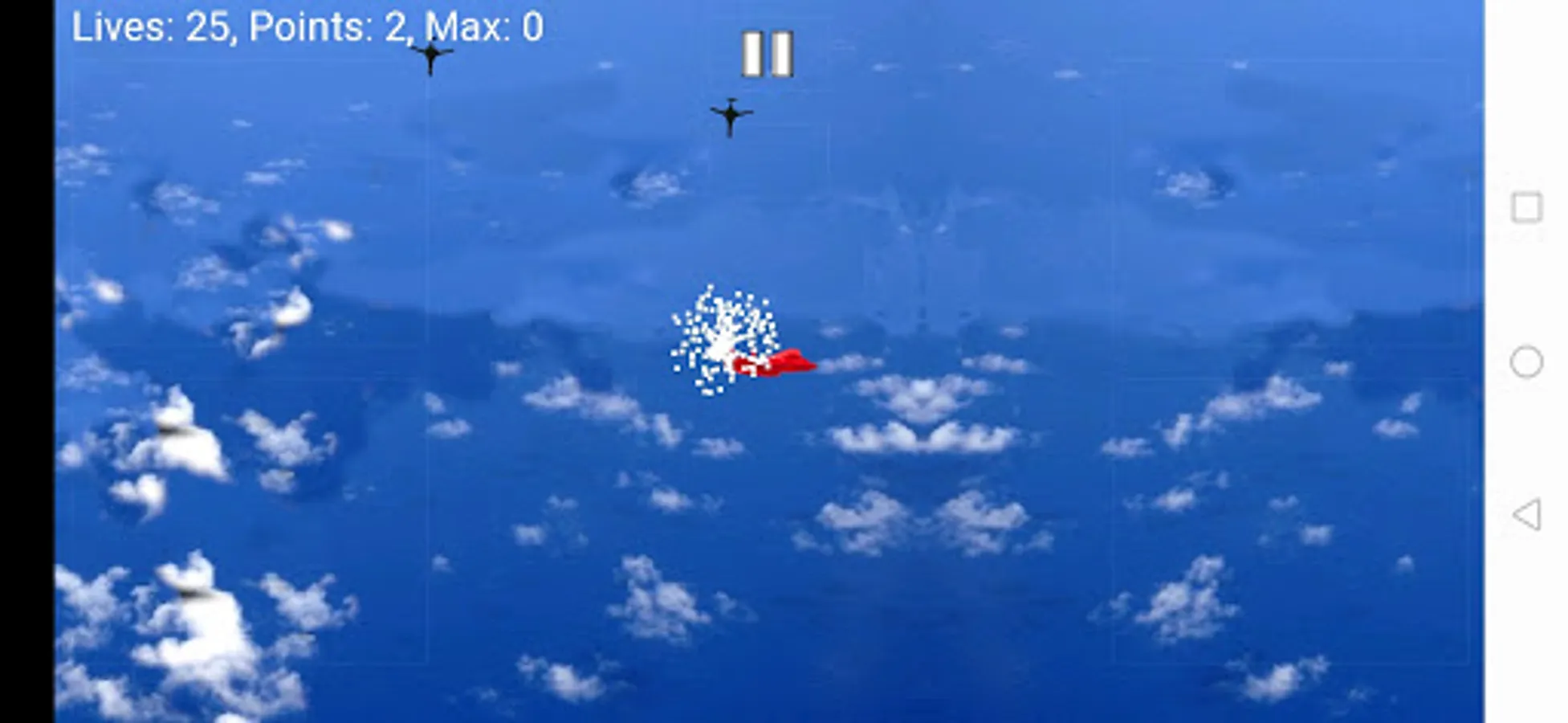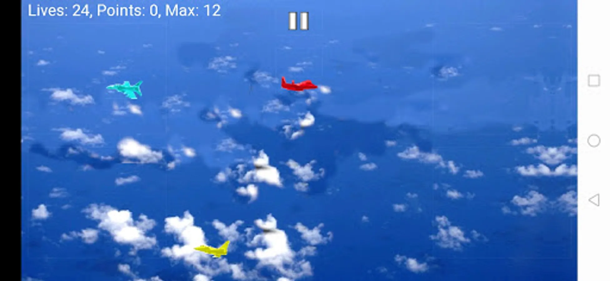Fighter planes shootout in the sky. Player's plane in red color, can flip direction, fire instantly and can move up and down across the sky. Player has more fire power than the enemy. Several enemy planes hunt the player: black planes don't have fire power but will randomly drop in the sky with risk of hitting the player; cyan planes will hunt the player and randomly fire when within range of player's altitude and distance; yellow planes will wander in the sky and can fire at the player as well when within range.