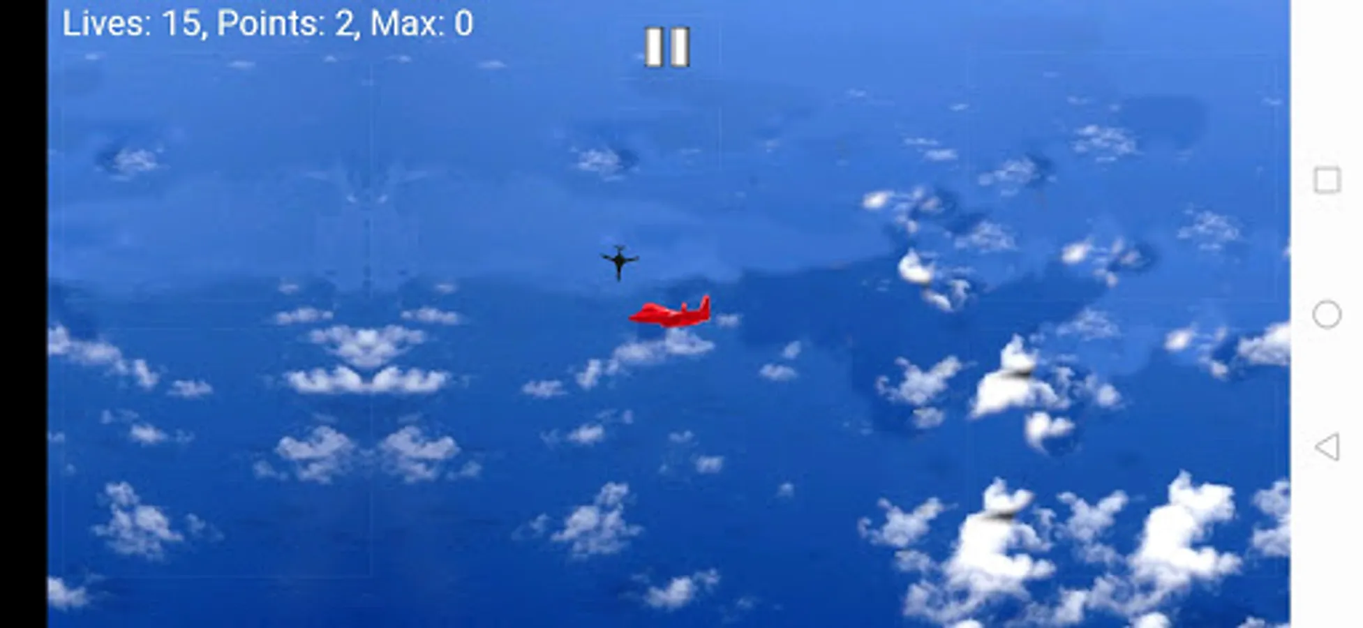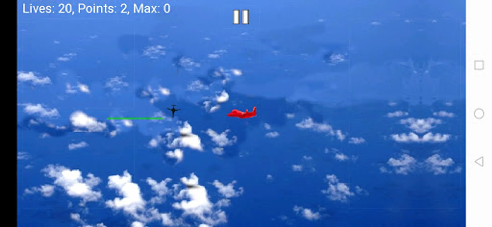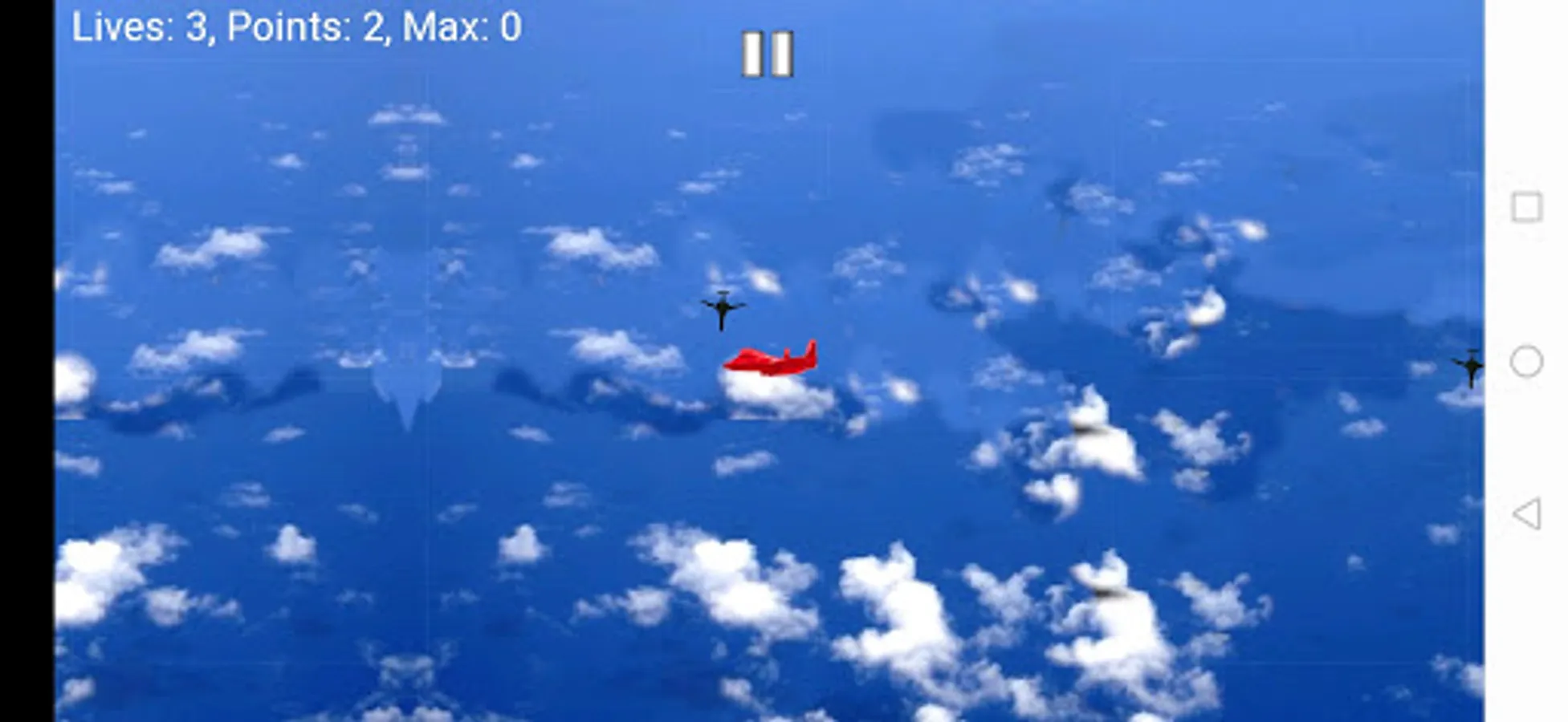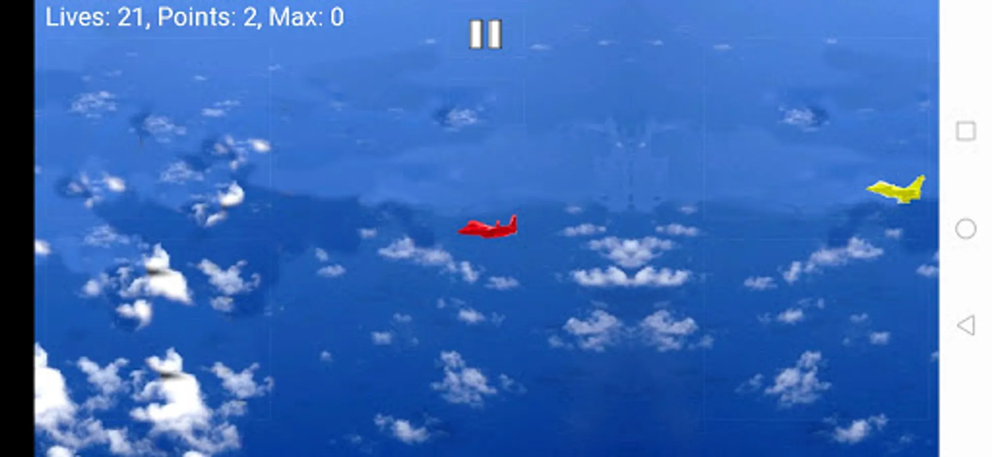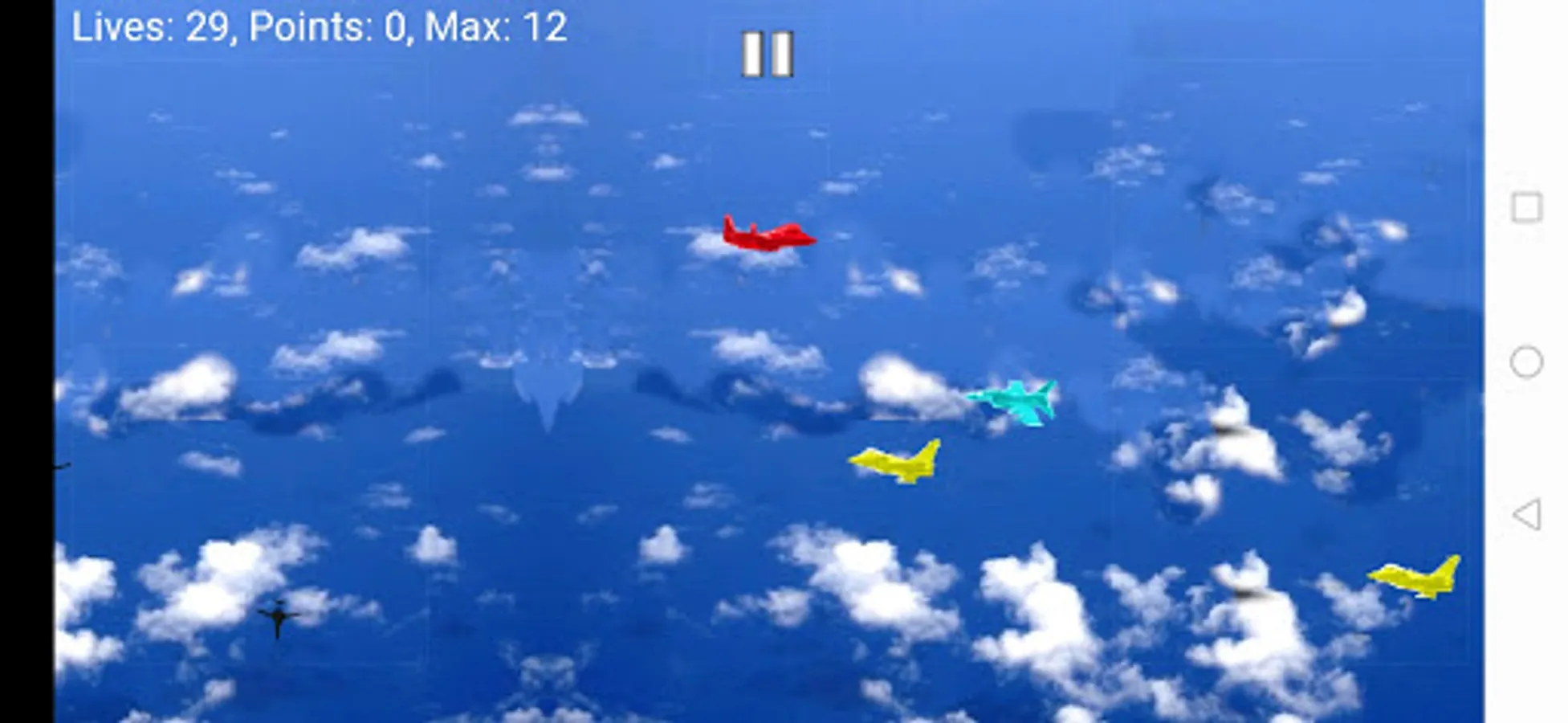 Fighter planes shootout in the sky. Player's plane in red color, can flip direction, fire instantly and can move up and down across the sky. Player has more fire power than the enemy. Several enemy planes hunt the player: black planes don't have fire power but will randomly drop in the sky with risk of hitting the player; cyan planes will hunt the player and randomly fire when within range of player's altitude and distance; yellow planes will wander in the sky and can fire at the player as well when within range.