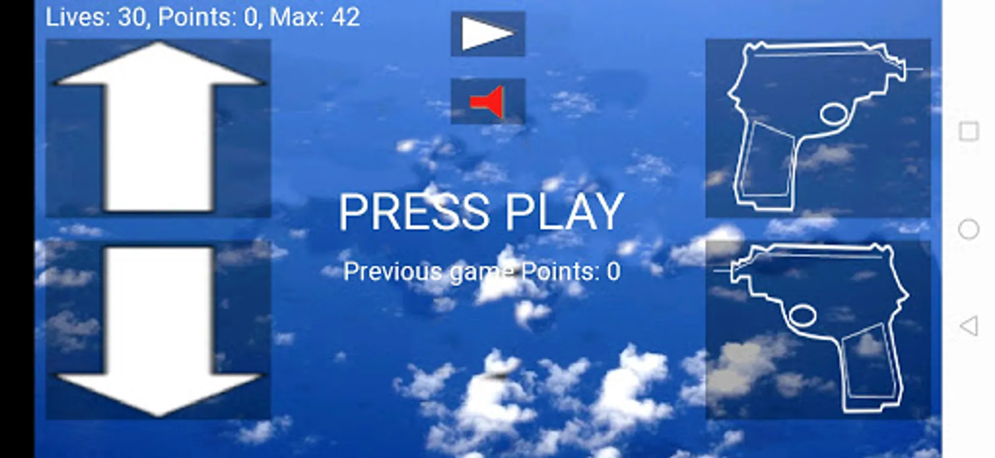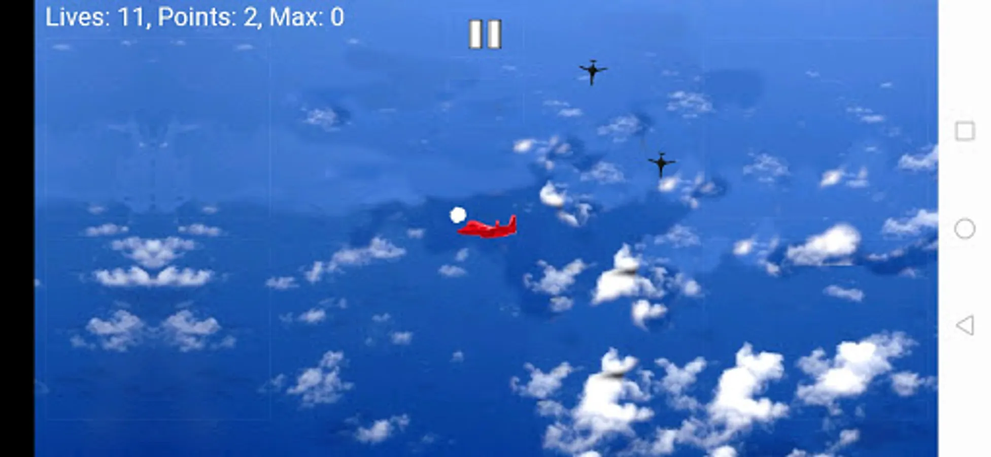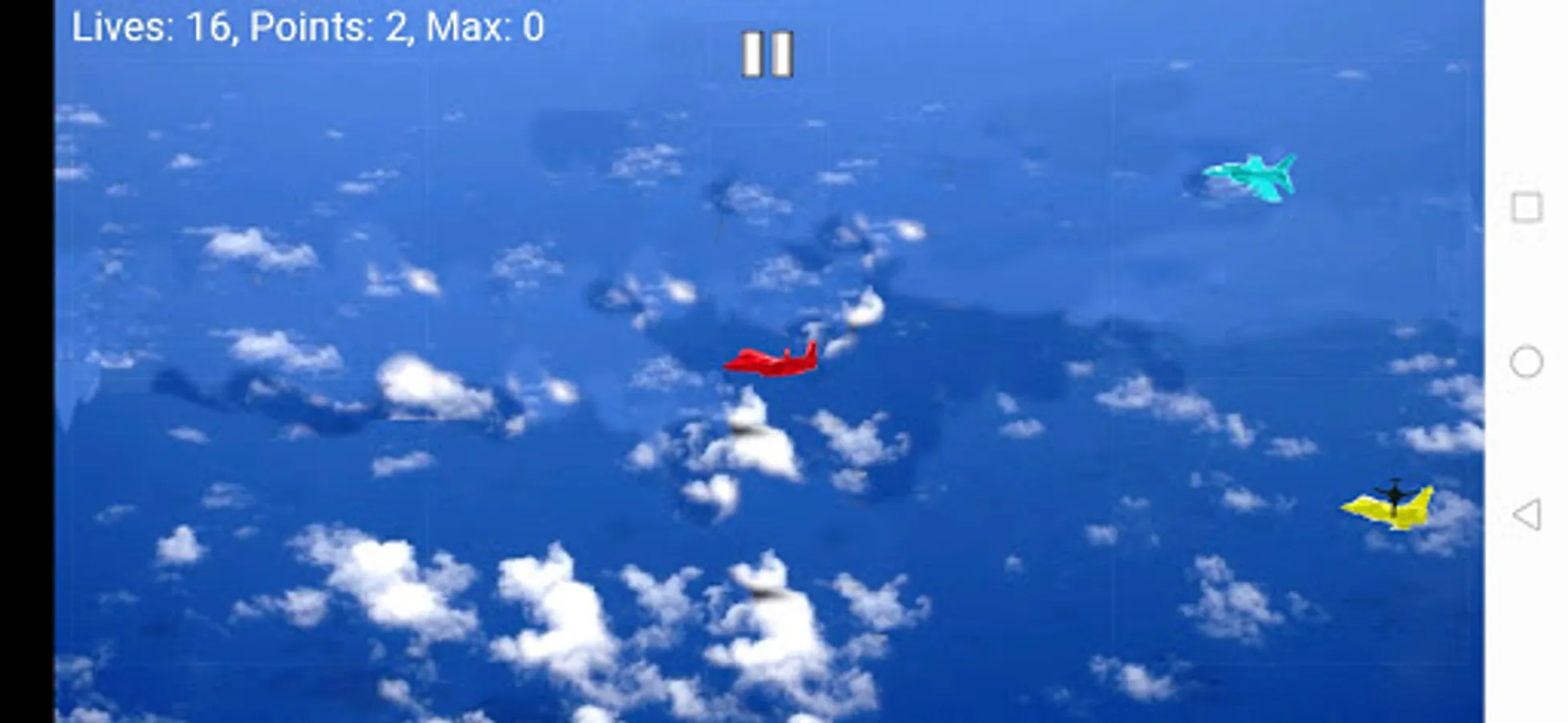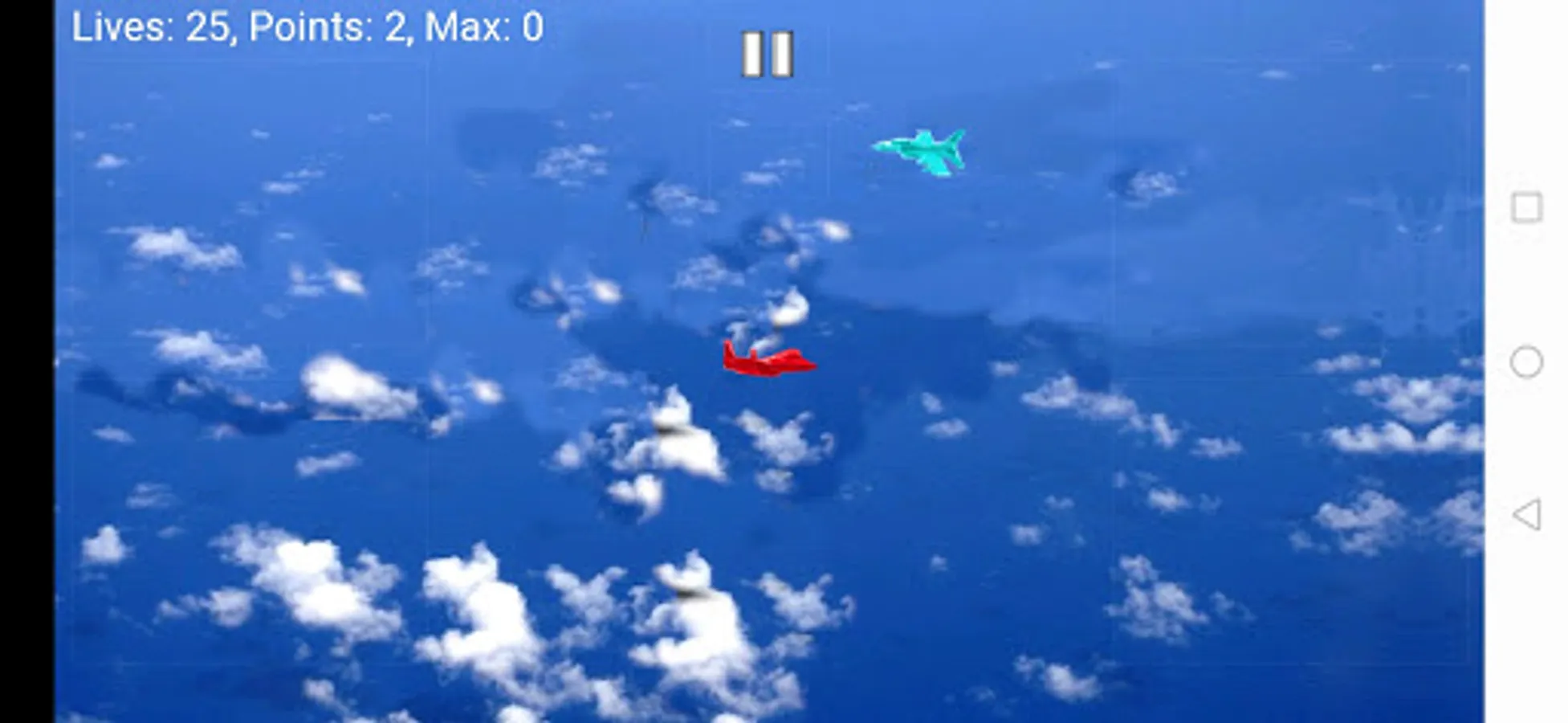 Fighter planes shootout in the sky. Player's plane in red color, can flip direction, fire instantly and can move up and down across the sky. Player has more fire power than the enemy. Several enemy planes hunt the player: black planes don't have fire power but will randomly drop in the sky with risk of hitting the player; cyan planes will hunt the player and randomly fire when within range of player's altitude and distance; yellow planes will wander in the sky and can fire at the player as well when within range.