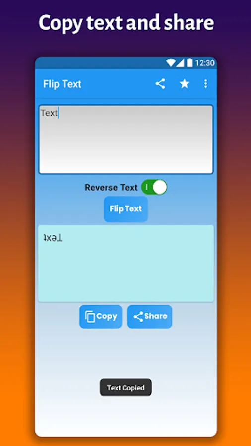 In this application you can flip the text or text is transform into upside down. You can copy and paste the text. In this application you will get share option to share the text with your friends.