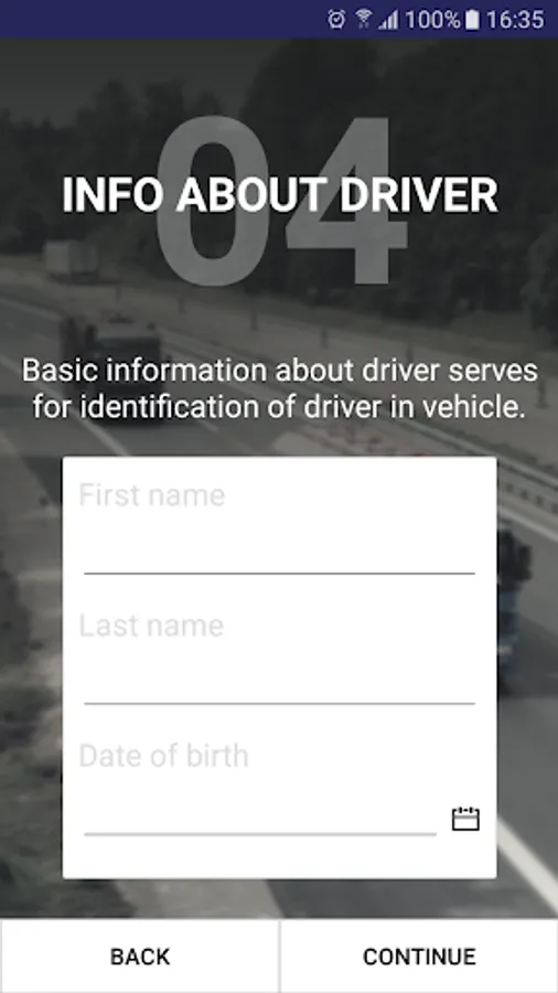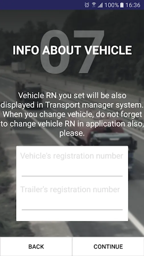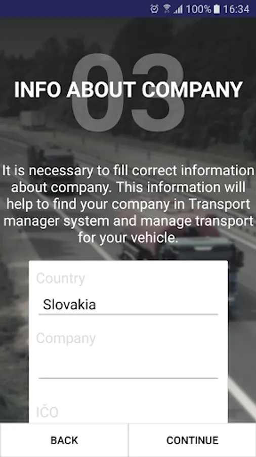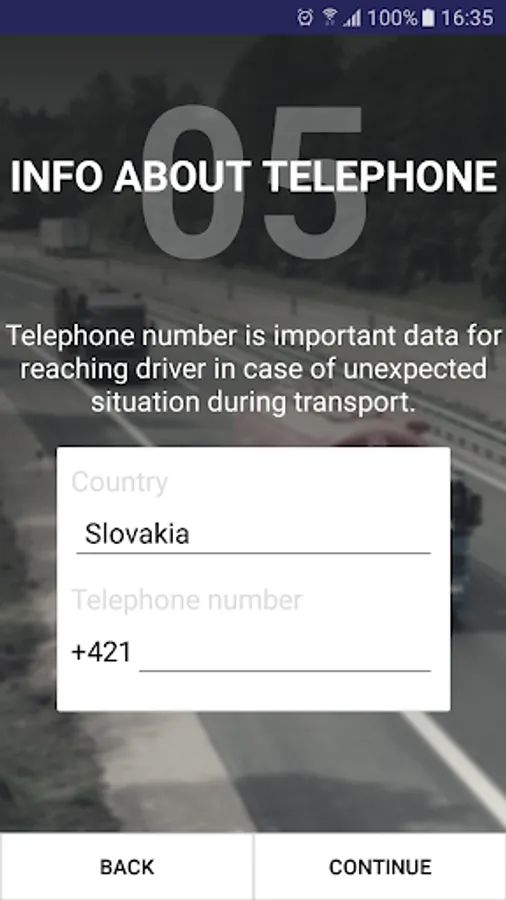 Requirement for application usage is unique registration of company and driver connected on phone number and smart phone`s IMEI number. For correct run of application it is necessary to have active mobile data (also roaming) and GPS.