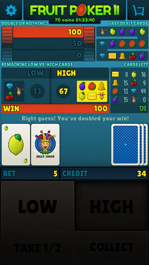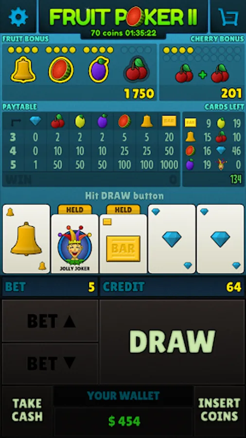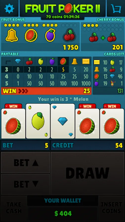 Fruit Poker II is the slot machine with fruity cards. Rules are simple, you must have so many same symbols as possible, maximum 5. There are bonuses for 2x cherry or 4x other symbols. You can double up your win by guessing symbol on the hidden card. You get 200 coins after installation and 50 coins every 12 hours. The maximum bet is 1.000.000 and maximum win is 500.000.000. Have fun with Fruit Poker II.