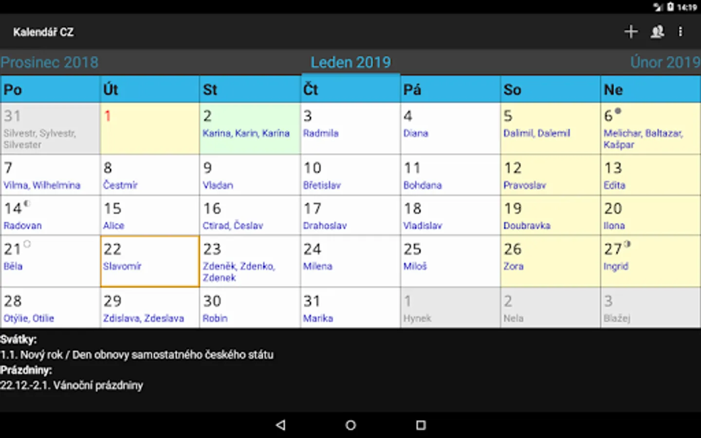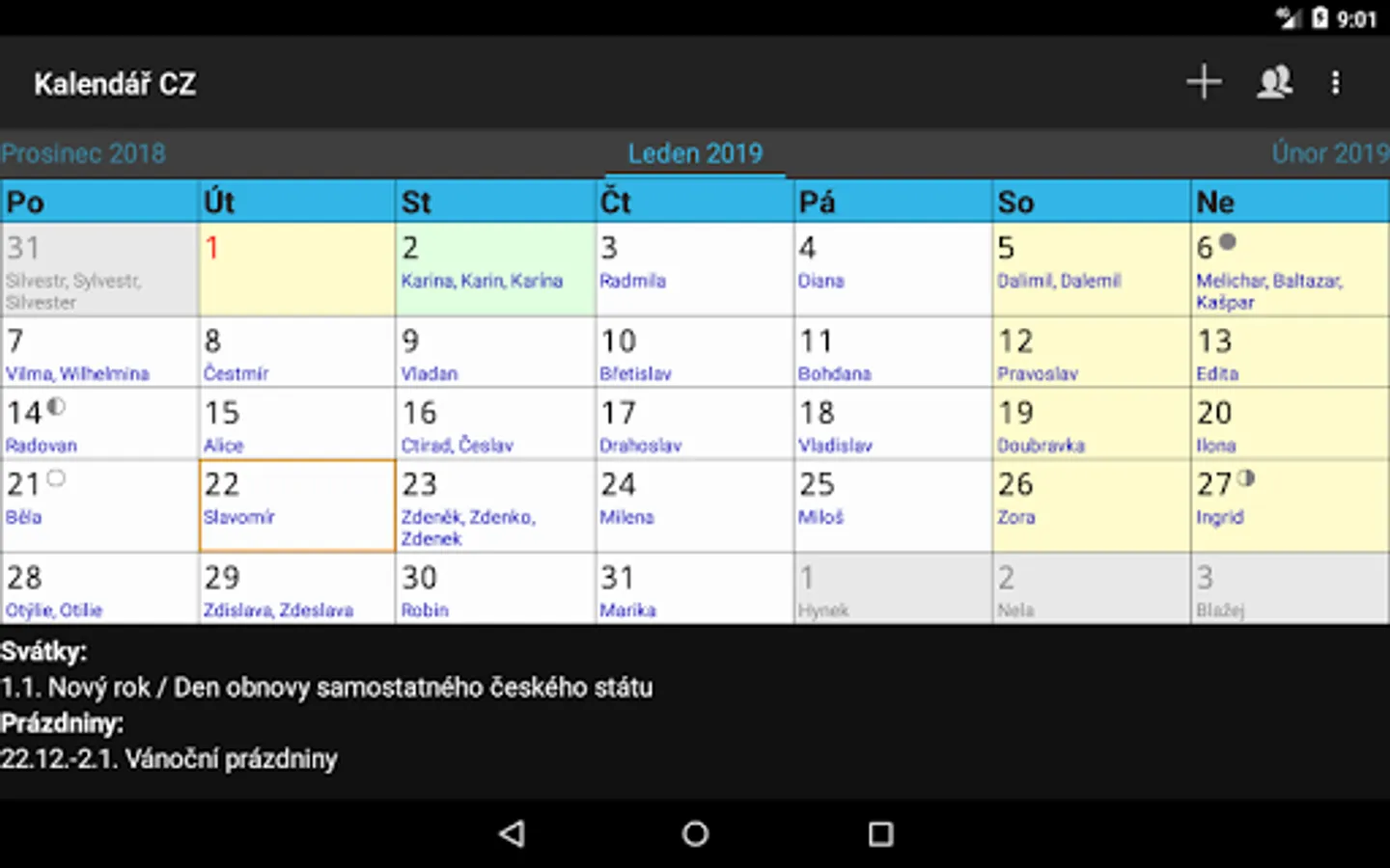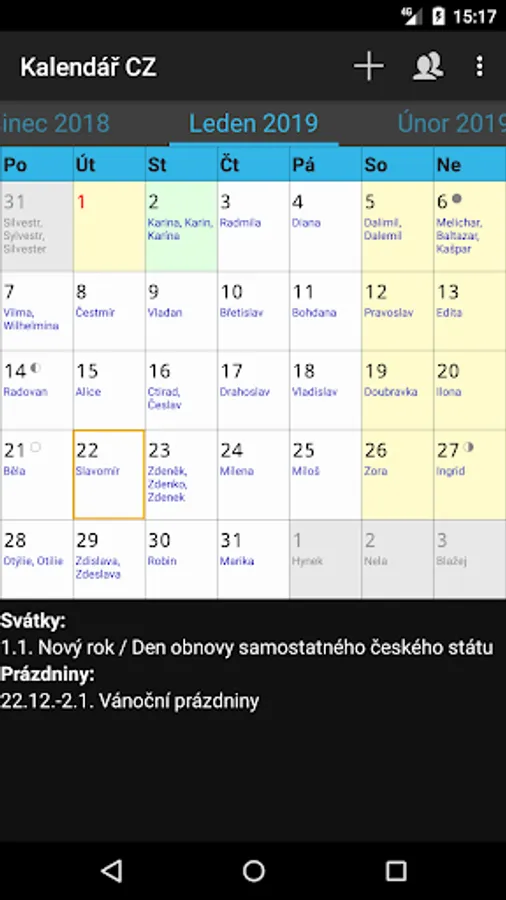 Calendar CZ. Your dates, Czech public holidays, name days and school holidays always at hand.