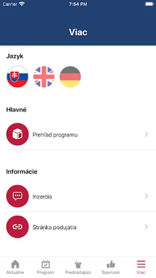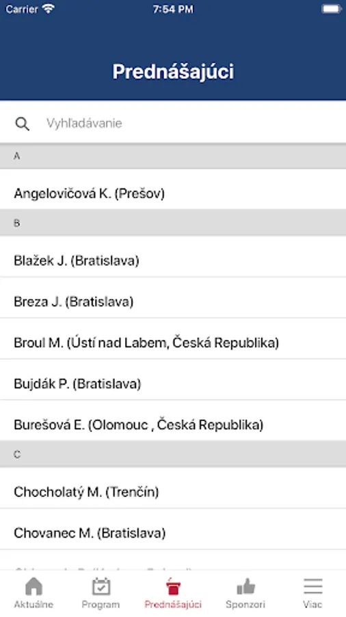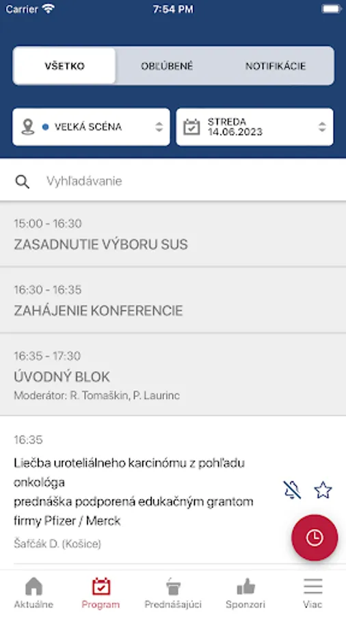 The program is structured according to time course, individual halls and lecturers/chairmen, which can be searched. With the help of the "Favorite" tab, it is possible to create your own program. With the help of the "Notifications" tab, you can add notifications for individual lectures.