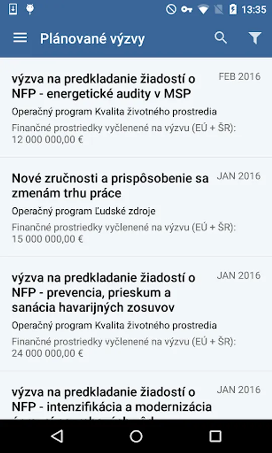 * prehľad plánovaných výziev spolu s možnosťou podrobného vyhľadávania