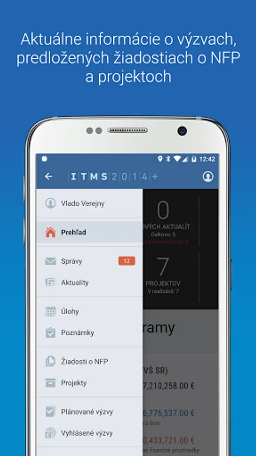The ITMS2014 + mobile application is an extension of the ITMS2014 + web application and its public services and functionalities available at www.itms2014.sk. The mobile application has no ambition to replace the functionality of the ITMS2014 + web application. Its purpose is to bring users faster and more compact access to information about planned and announced calls, the status of submitted NFP applications and projects, or to expand the functionality of the ITMS2014 + system.