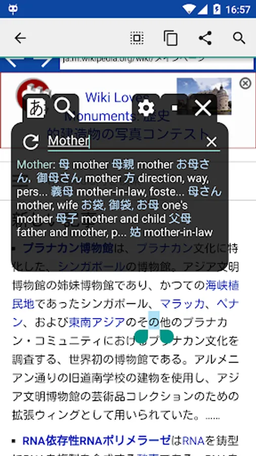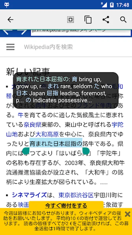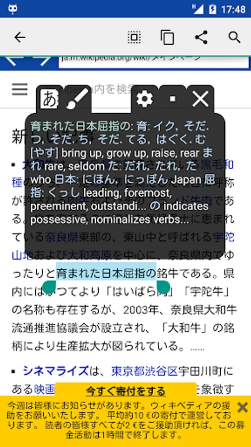 Imagine yourself opening a Japanese web page in your favourite browser, or reading a Japanese novel in your favourite book reader. Suddenly, you encounter an unfamiliar kanji. No longer do you need to navigate your phone to the dictionary app, to translate that pesky kanji - just copy a Japanese sentence to a clipboard and watch a floating window as it pops up and analyses the copied text. The window floats over the browser/reader, allowing you to quickly look up unfamiliar kanji and then to continue reading, without being disturbed by switching to a translator app.