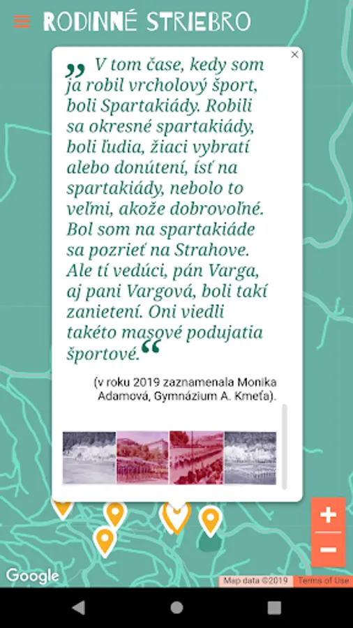 Get to know Banská Štiavnica differently. Get to know the city through the recollections of locals, natives and those who have spent part of their lives here. Find out where they were having fun, working, going shopping. Data used in the application come from a scientific survey of ethnologist of the Slovak Mining Museum Zuzana Denková and materials obtained in 2019 from the inhabitants of the city students of Gymnázium Andrej Kmet under the leadership of the teacher Miron Breznoščák. The application was released as part of the Banská Štiavnica 2019 project: Renovation of Identity (City of Culture) with financial support from the Art Support Fund.