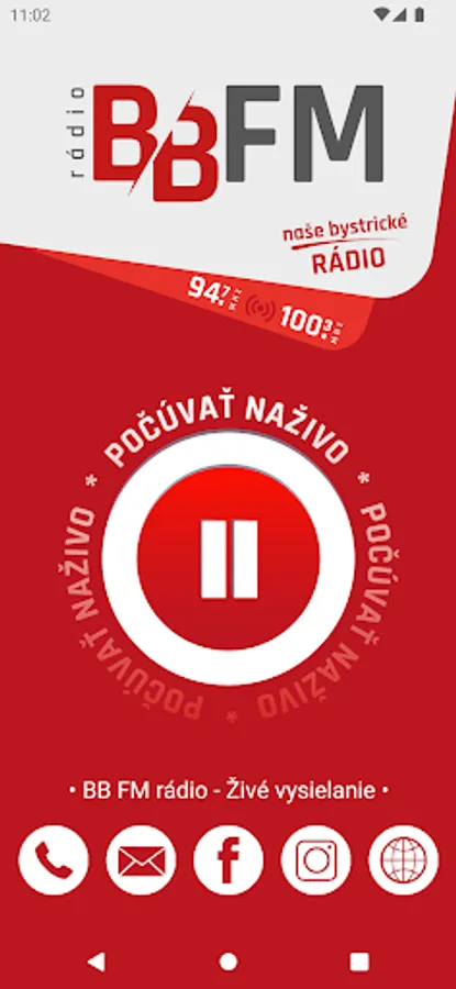 With the BB FM radio 94.7 application, you can listen to your favorite Banská Bystrica radio anywhere. Find out what's happening in your city, avoid traffic restrictions in the region and listen to great music. You can immediately listen to the BB FM radio by simply tapping the player. You can also contact us via social networks, by phone or by e-mail, thanks to the icons at the bottom of the application.