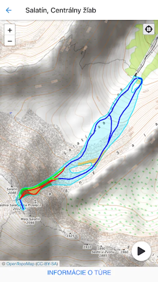 The maps show parts of the route zones with different slopes, the significance of which for the release of the avalanche by the user depends on the declared level of avalanche danger. However, the slope of the sliding layer of the avalanche, due to the variety of snow deposition, may differ locally from the slope of the slope indicated in the application, which was determined on the basis of the state map work - the raster equivalent of the base map 1:10,000. Therefore, it is only a warning about the possible danger in the given place ascent or descent.