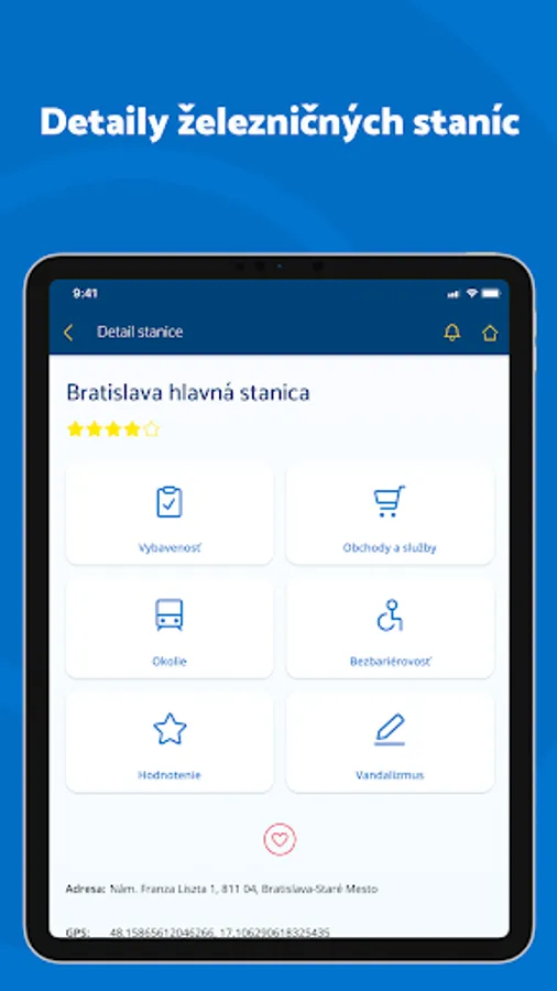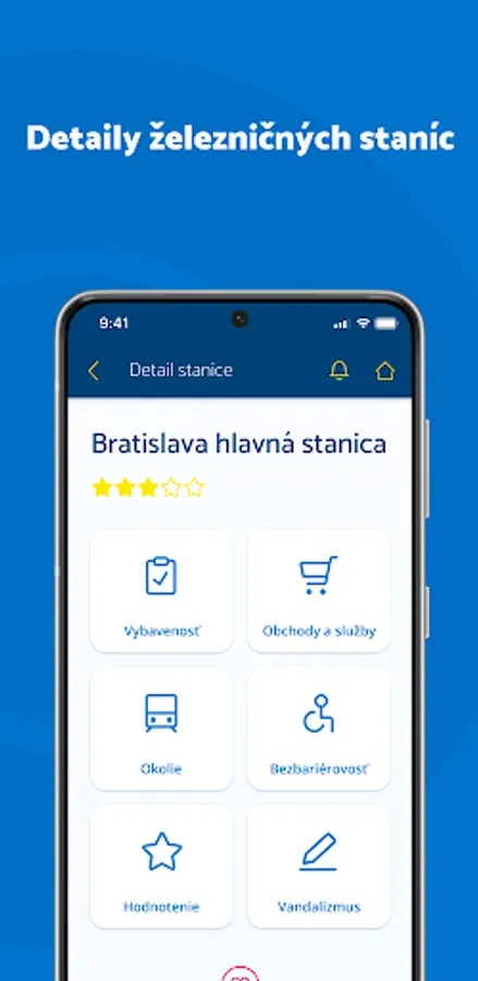 The iStanica mobile application provides information about railway stations and railway stops. One of the main features is a clear list as well as a map of railway stations. Each station has information about facilities, services and the surroundings of the station. You can also use the app to view station ratings, as well as add your own. An important part is also the information overview about the equipment of the stations for the disabled. Last but not least, thanks to the application, it is possible to report any problem that occurred at the railway station or stop.