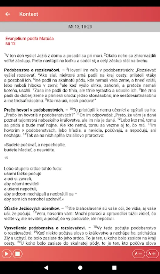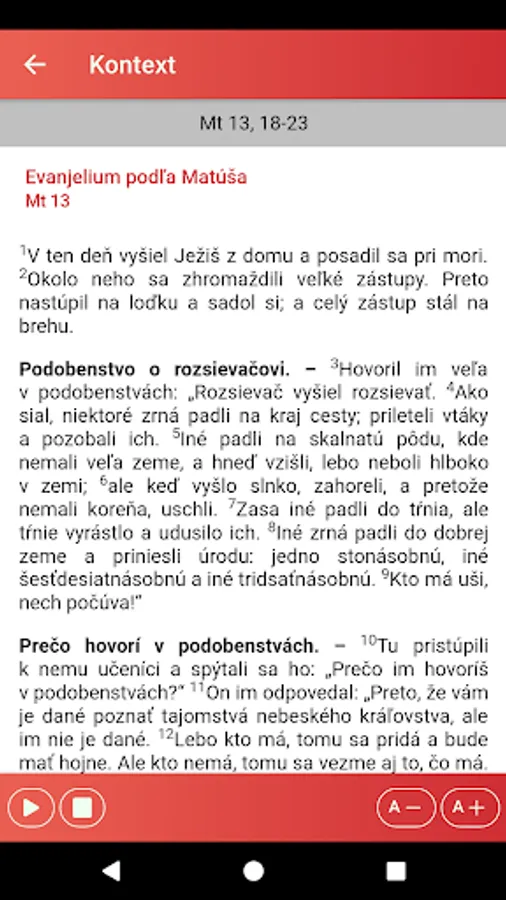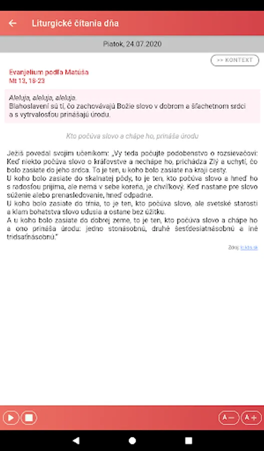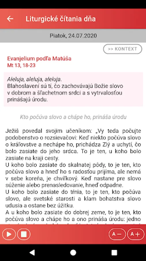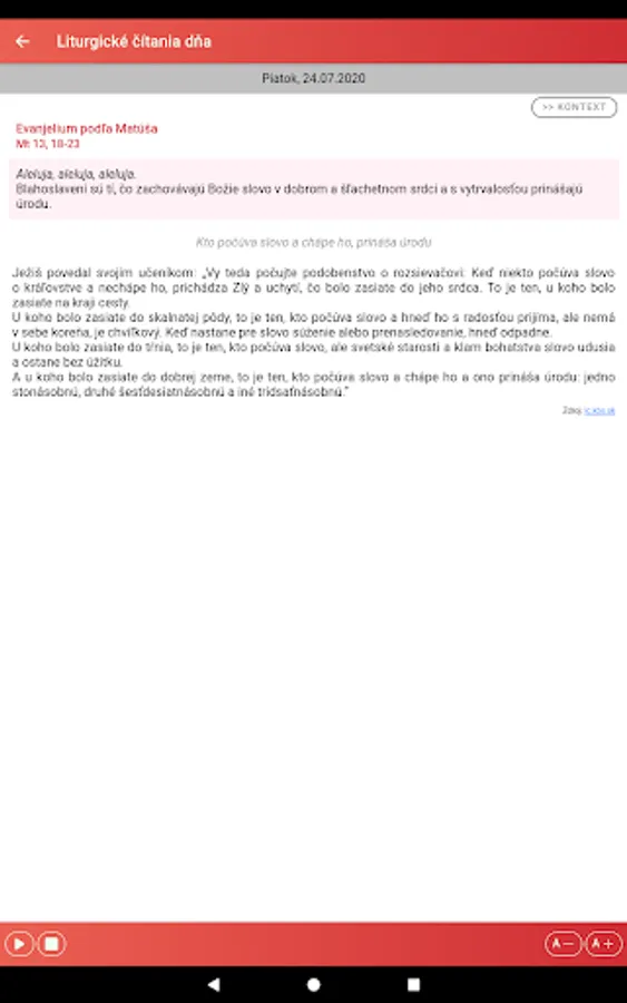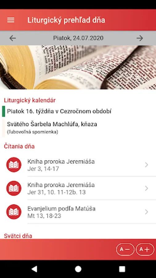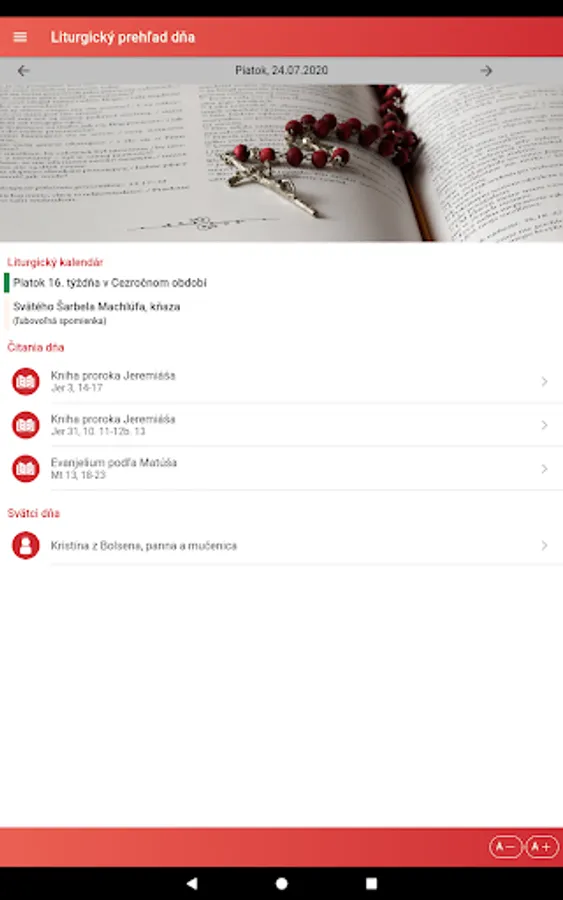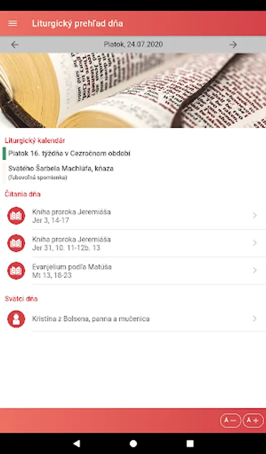 The "Liturgical Reading" application is intended especially for Catholics who want quick access to current liturgical texts read during services. It is a good aid for meditating on the biblical liturgical text and preparing for Holy Mass. We recommend it not only to priests and lecturers, but to all believers who want to have a greater spiritual benefit from the worship of the word in the Holy Mass.
