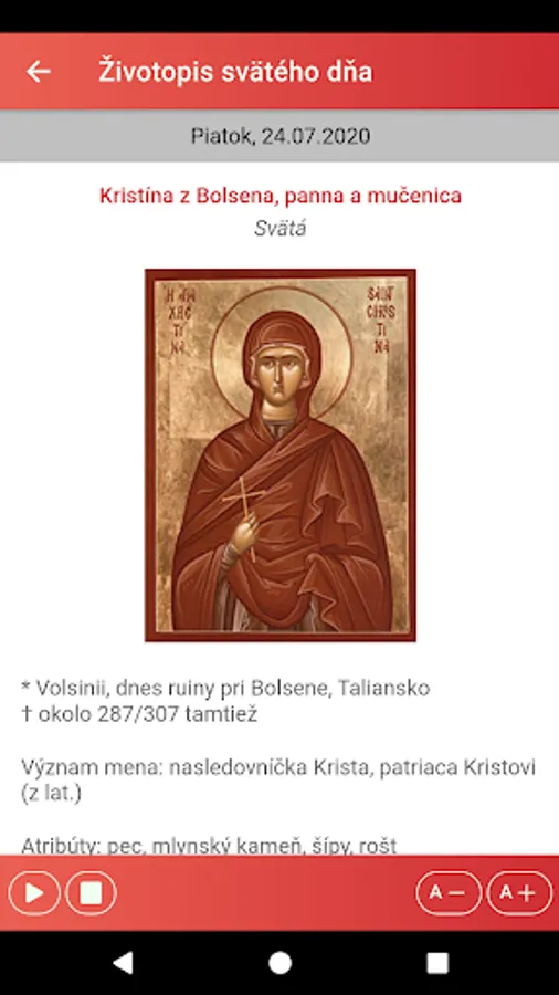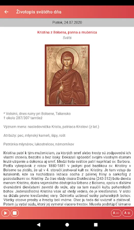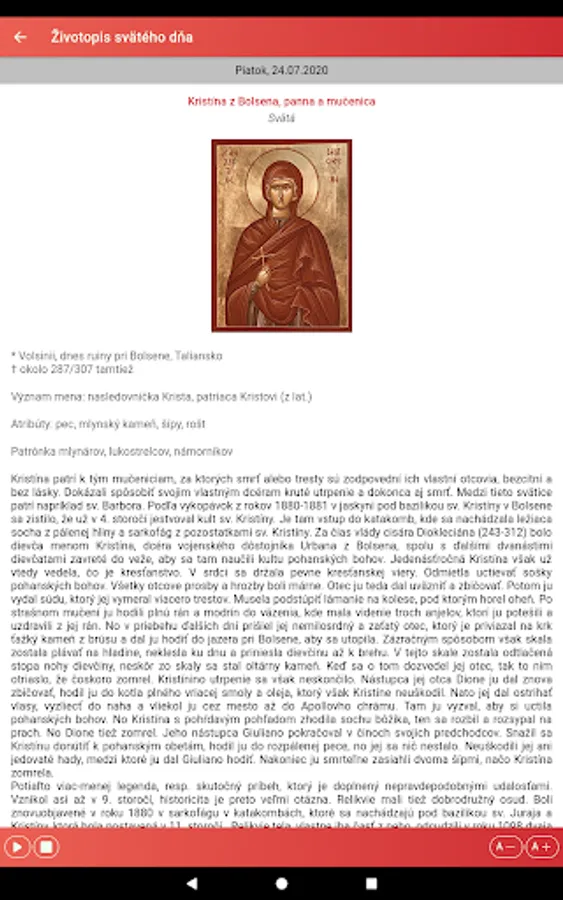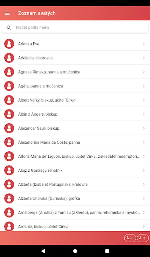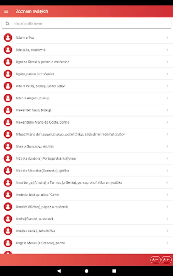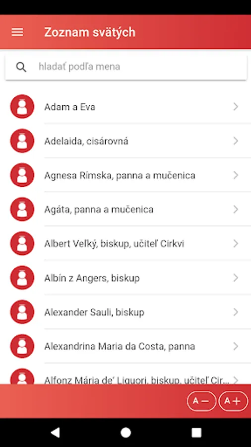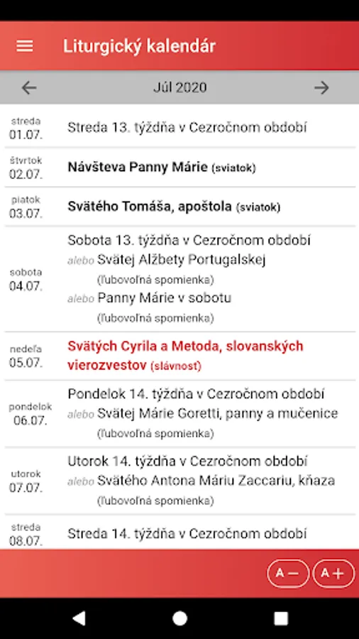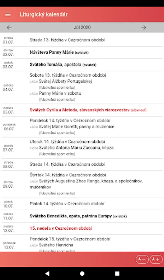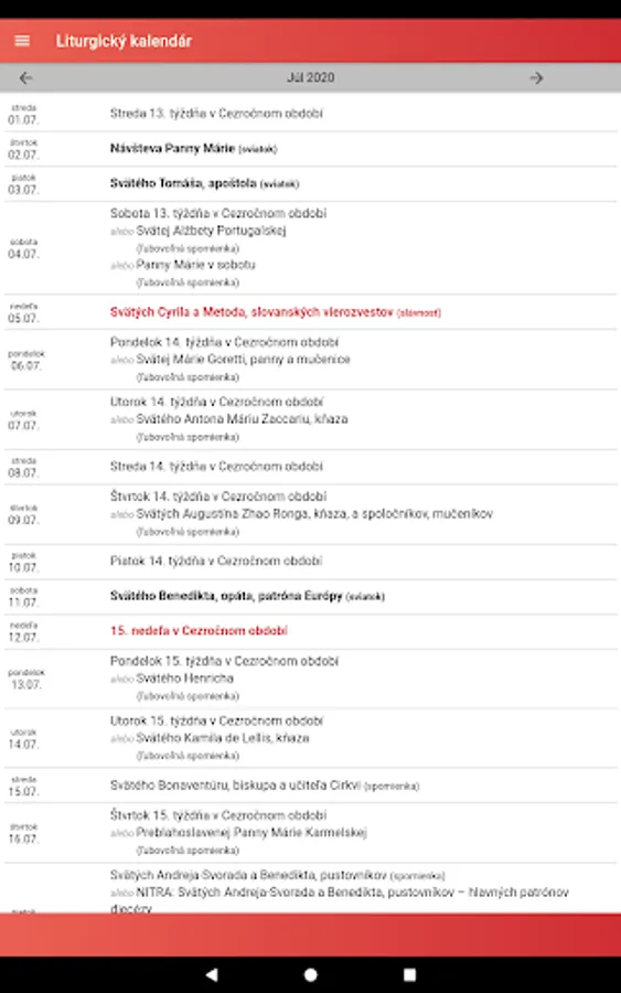 The application also offers a display of the liturgical calendar by months and a list of saints with the possibility of searching for them.