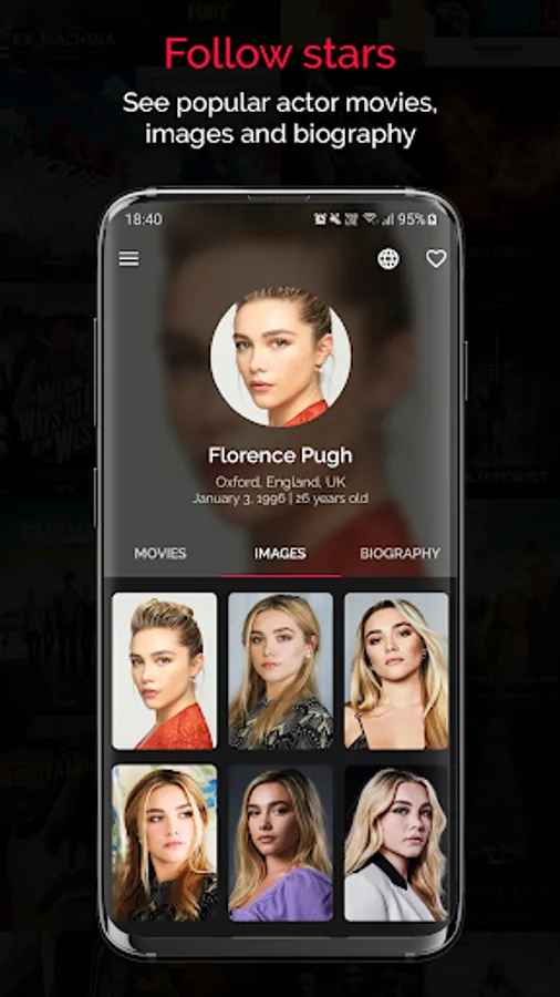 Search for specific movie, person or production company. Share, download movie and celebrity images. Open them on IMDB, Youtube and social networks or quick browse movies and celebrities to get even more information via google search.