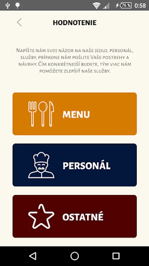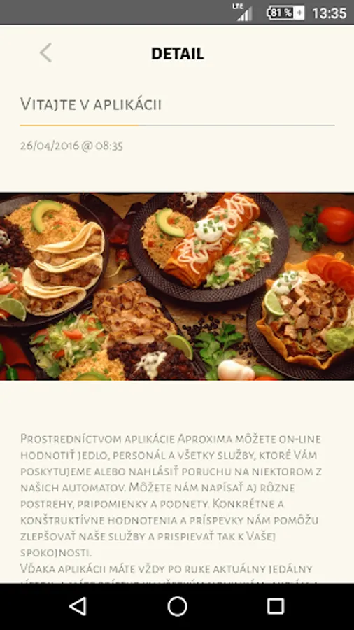 Through the application can Aproxima online value of food, the staff and all the services that we provide or report a fault on one of our machines. You can write the different observations, comments and suggestions. Concrete and constructive evaluations and contributions help us to improve our services and so contribute to your satisfaction. Thanks to the application right at your fingertips current menu and have access to all the news, events and information that will periodically mediate.