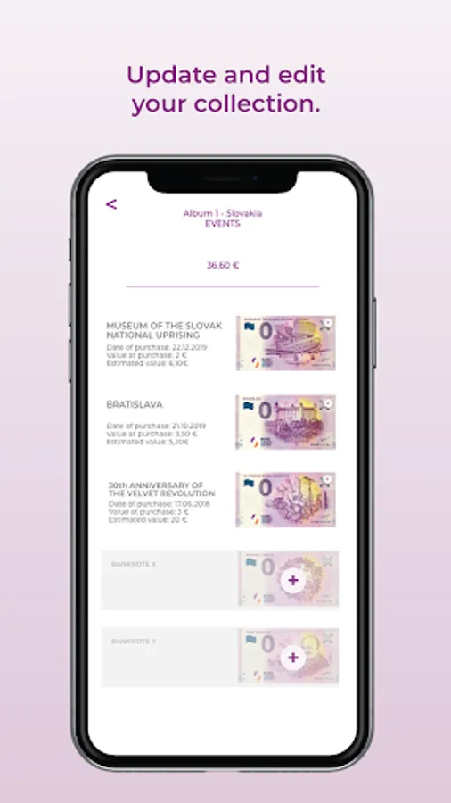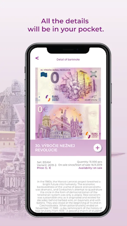 We bring you a new mobile application about Euro Souvenir banknotes. Download our handy tool to your mobile phone and always have it at hand. EuroSouvenir app is available for iOS and Android operating systems. This application serves mainly to banknotes search and creating albums - collections, at the same time you will find there everything about Euro Souvenir banknotes, including information about their point of sale. You will also be always informed about news. Advantage is that it is possible to create own albums where you will be able to store banknotes from your collection and also watch which banknotes do you miss.
