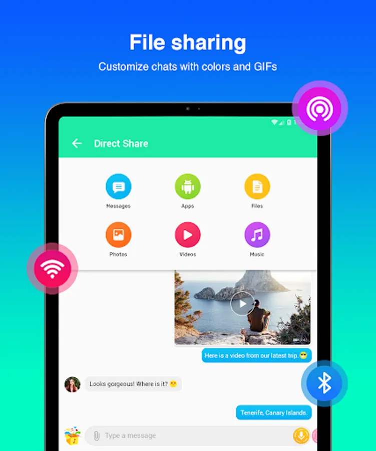 Direct send and receive messages, documents, files, photos and videos via bluetooth or Wi-Fi. No internet connection needed.