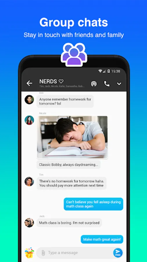 Choose what you want to send. Send and receive Free Messages (depending on your data rates) , SMS, MMS, unlimited Text or Photos in a single conversation.